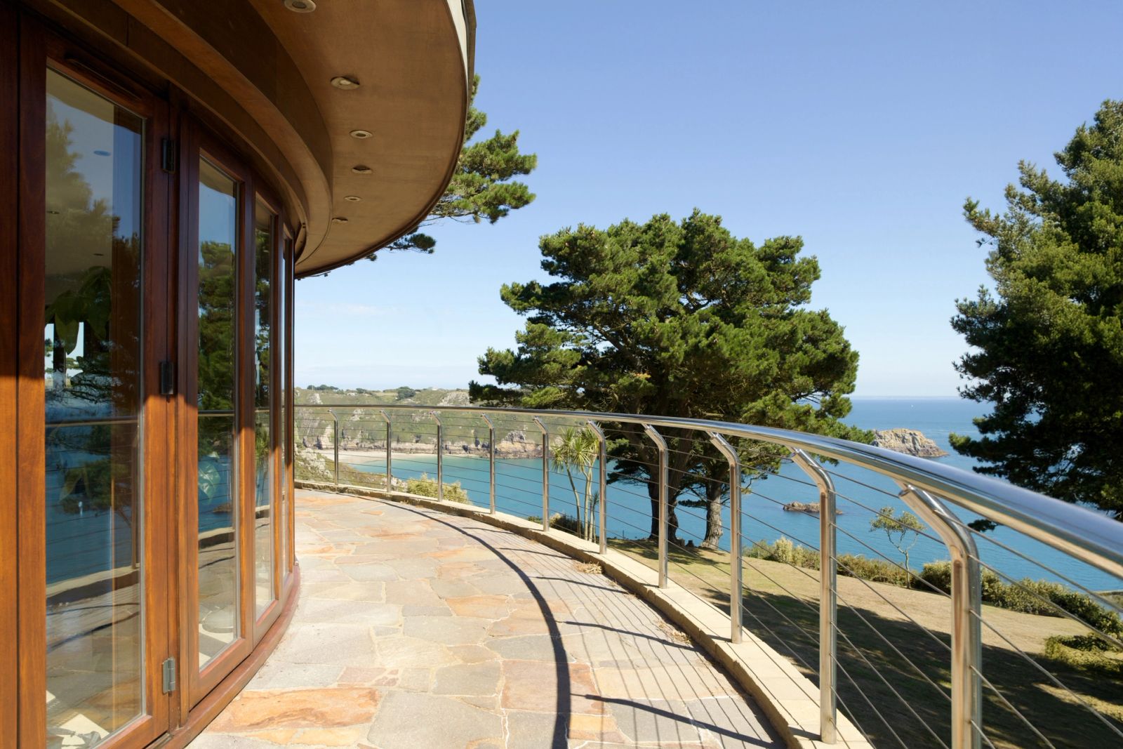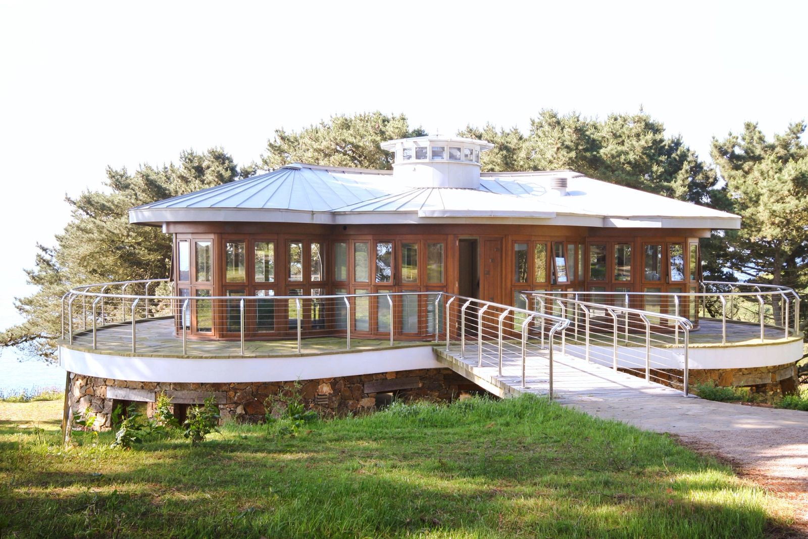 The new house sits naturally on the rocky cliff edge, nestled among mature pine trees. The lower floor appears to grow from the rock itself, constructed in large, un-pointed granite blocks that integrate the building with its dramatic setting.