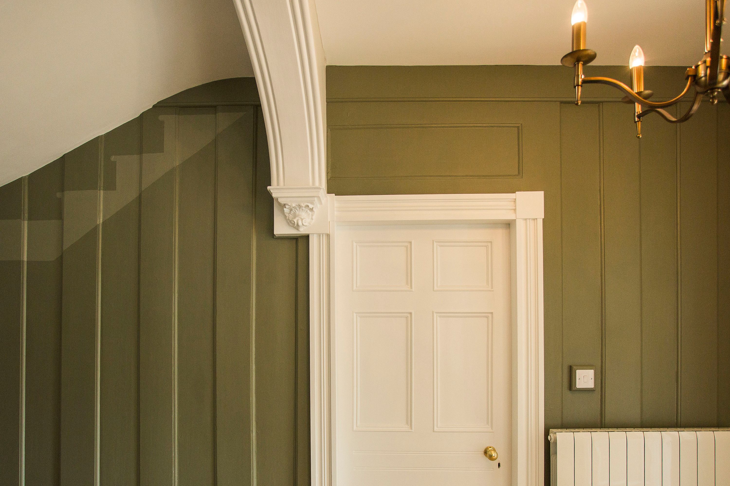 A flat-roofed, Georgian-style orangery replaced a 20th Century conservatory, and the original plan form was largely retained. During works, 18th-century panelling and a concealed doorway were uncovered, prompting a layout revision to reveal the original dining room entrance.