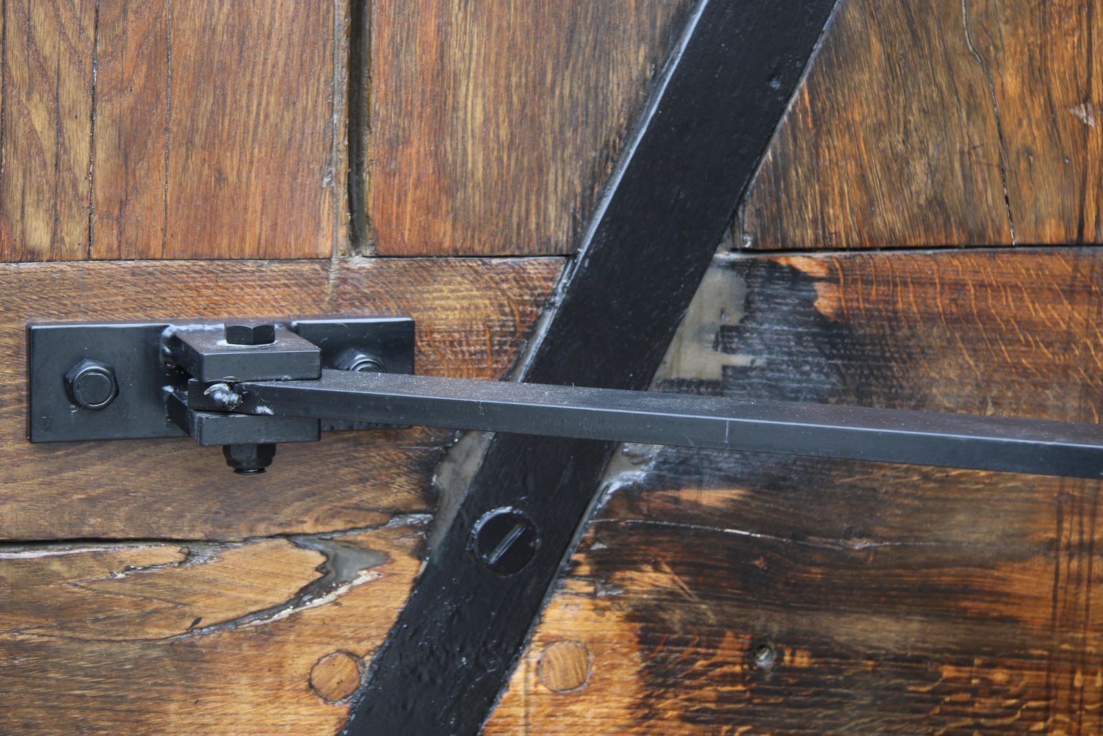 The gates’ four main iron ‘C’-profile hinges were severely corroded, with some rivets almost destroyed. After careful removal and rebuilding using specialist 'chemical' metal, the hinges were successfully retained. Flat bracing was replaced, and automation installed to allow practical, everyday use.