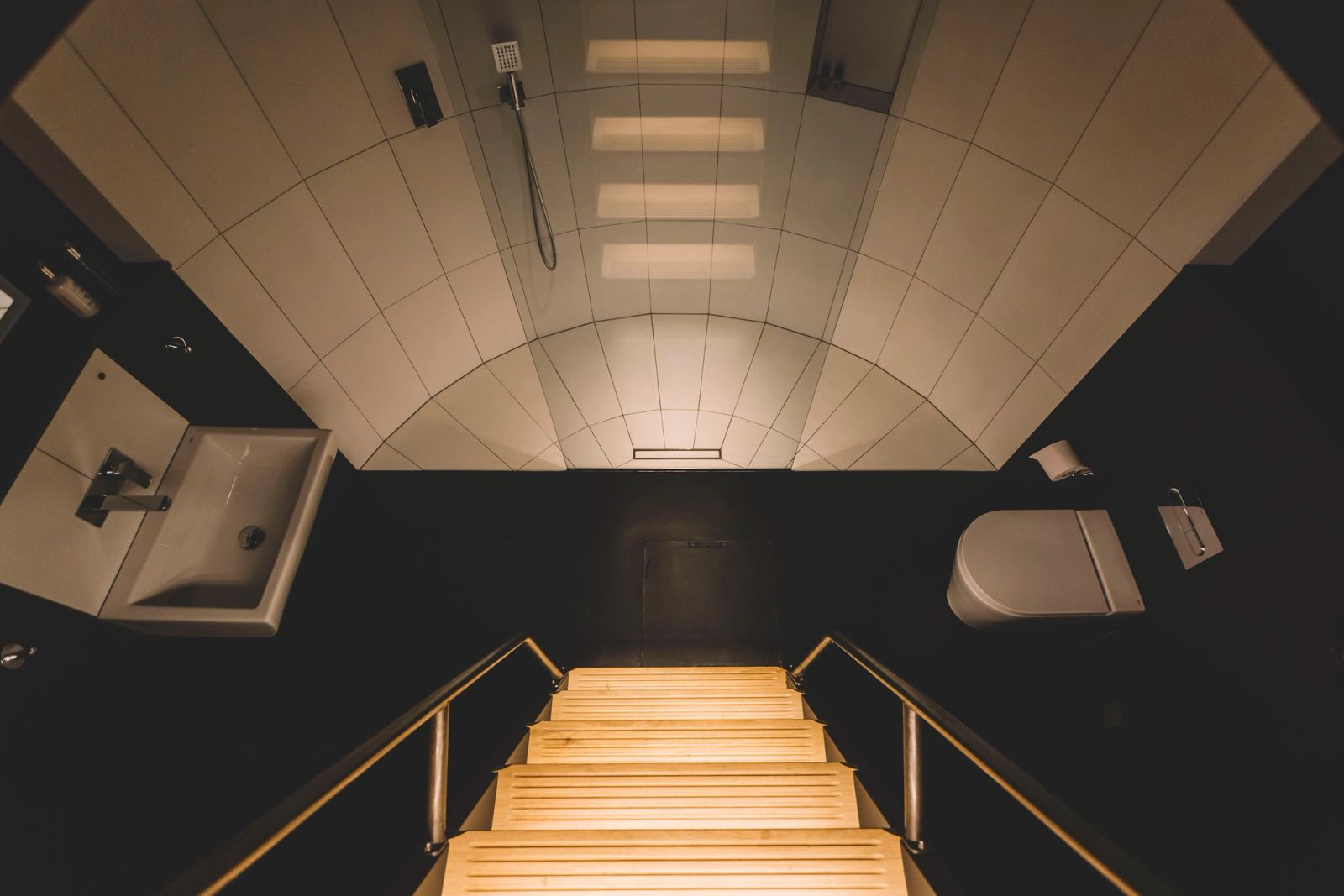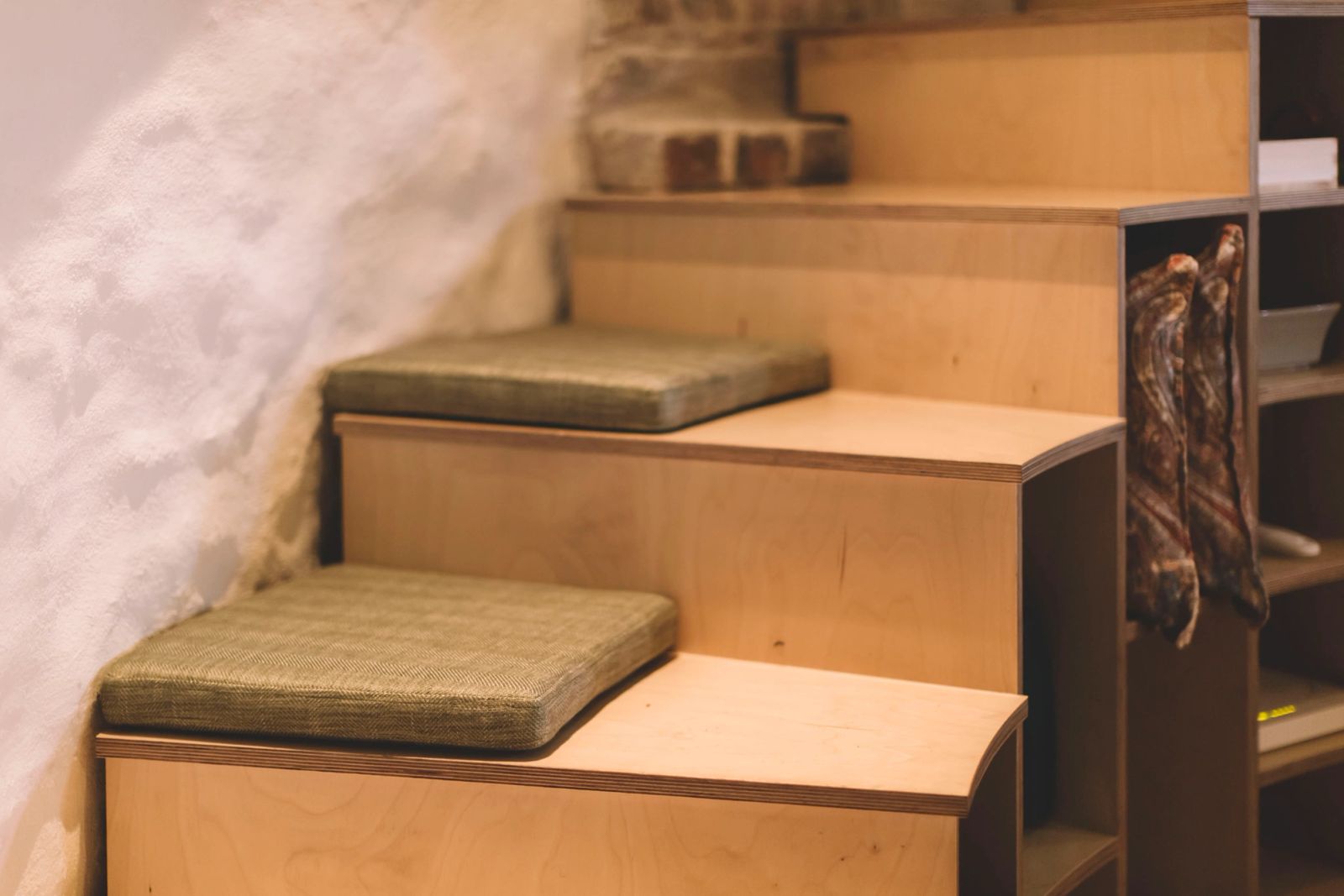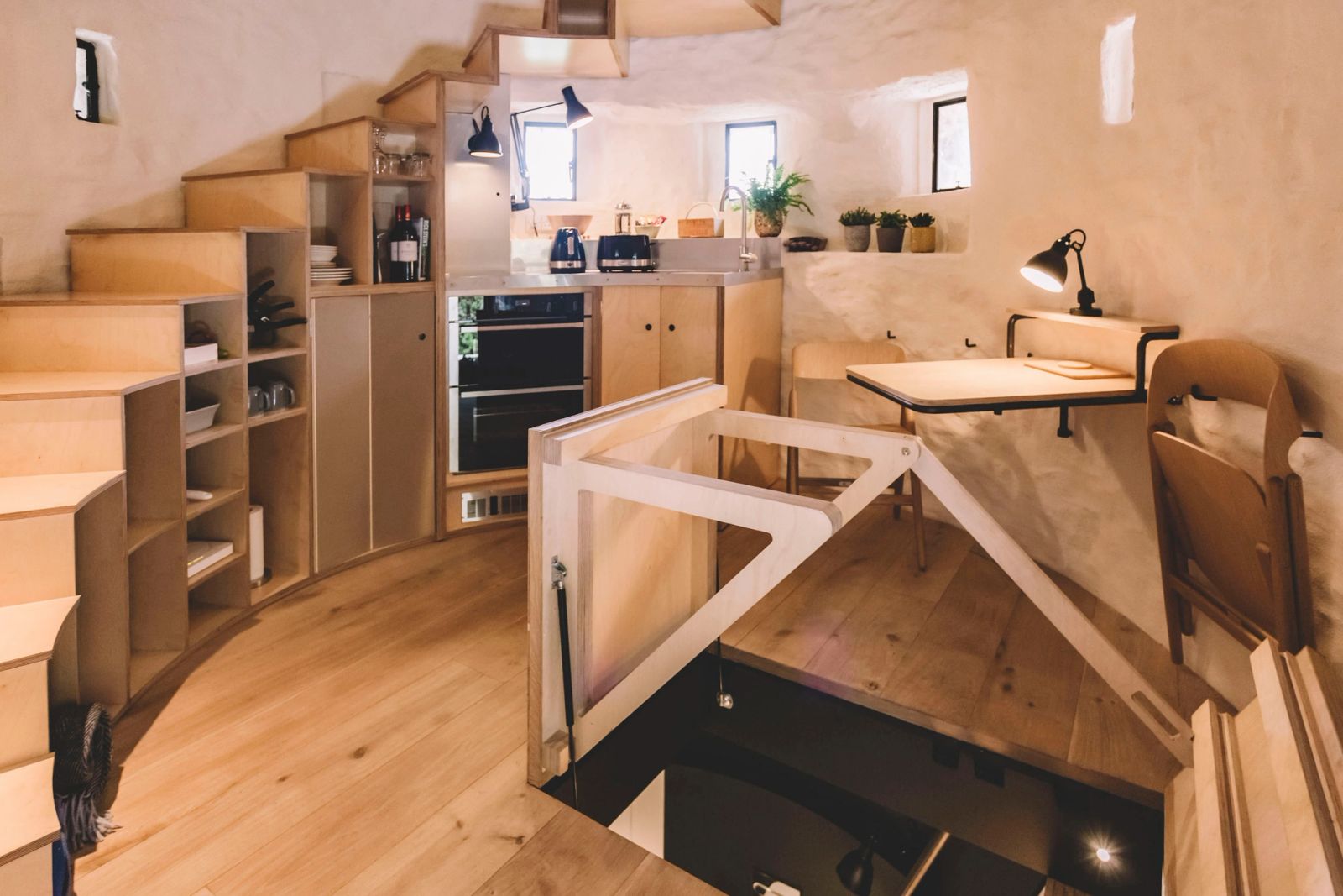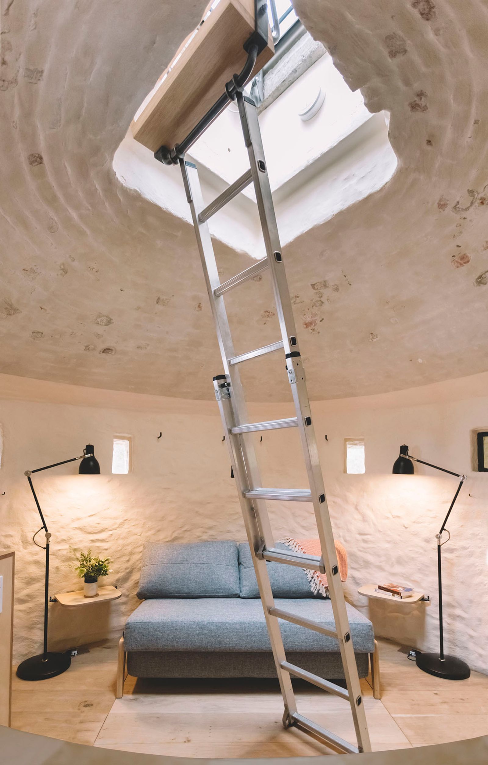 Accommodation spans three floors and a roof terrace, connected by custom-designed ladders and a central staircase. This staircase embodies the ingenuity required: precisely tailored to the tower’s dimensions, it integrates storage and a kitchenette, while being fabricated in parts small enough to pass through the narrow entrance.
