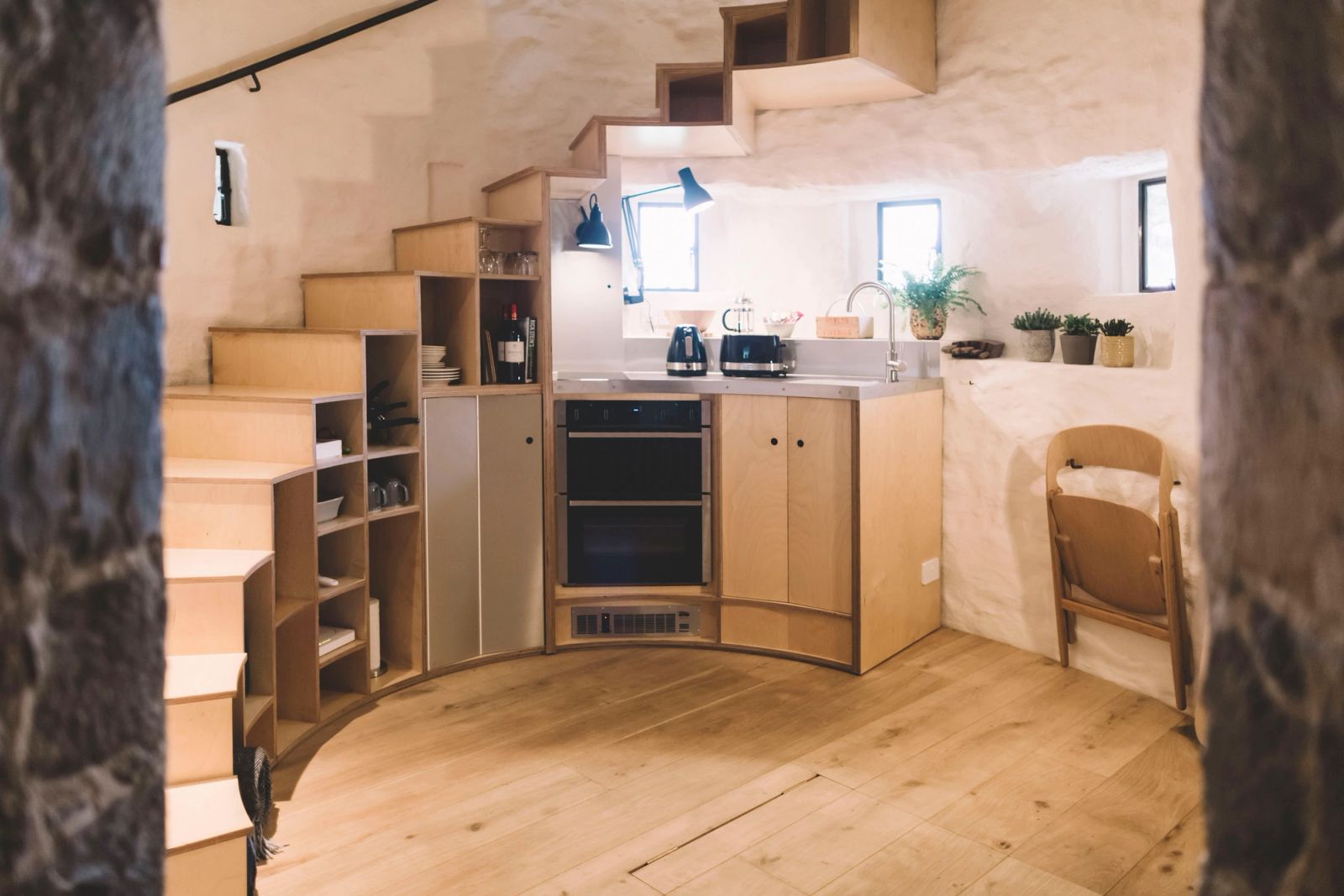 The result is a bespoke conversion into a unique self-catering retreat. Within its compact circular plan, a contemporary fit-out has been designed to sit apart from the historic fabric, retaining the essence of the tower’s rugged character while offering the comforts of modern living. Old and new are set in deliberate contrast, their dialogue evident throughout.