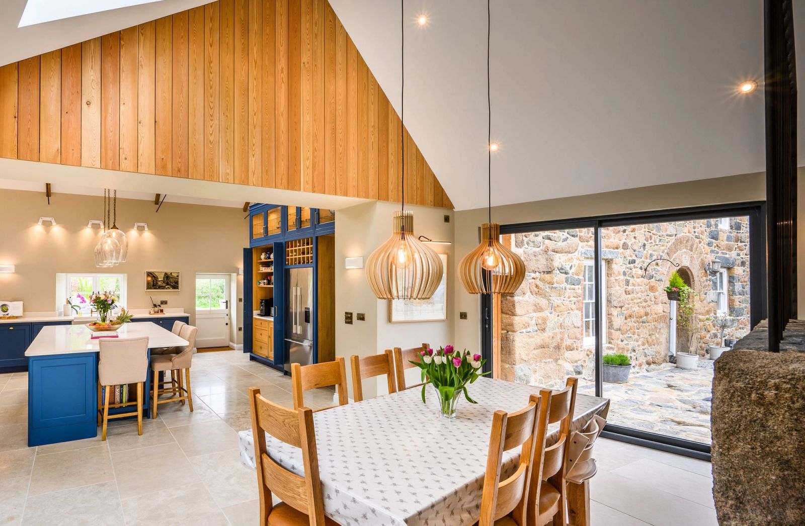The link extension is deliberately contemporary. It avoids imitation, instead drawing inspiration from agricultural forms – with timber boarding and a metal-clad roof – creating a modern addition that sits comfortably within its historic surroundings.