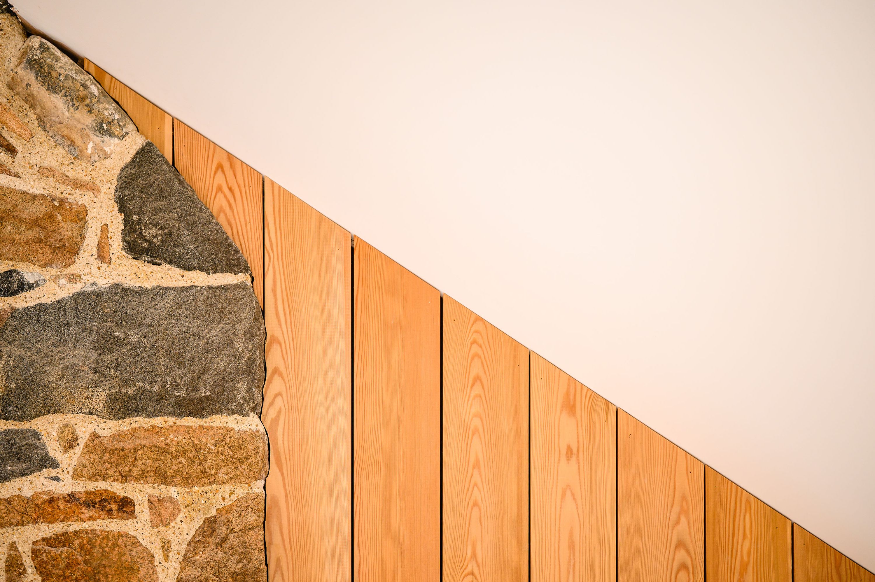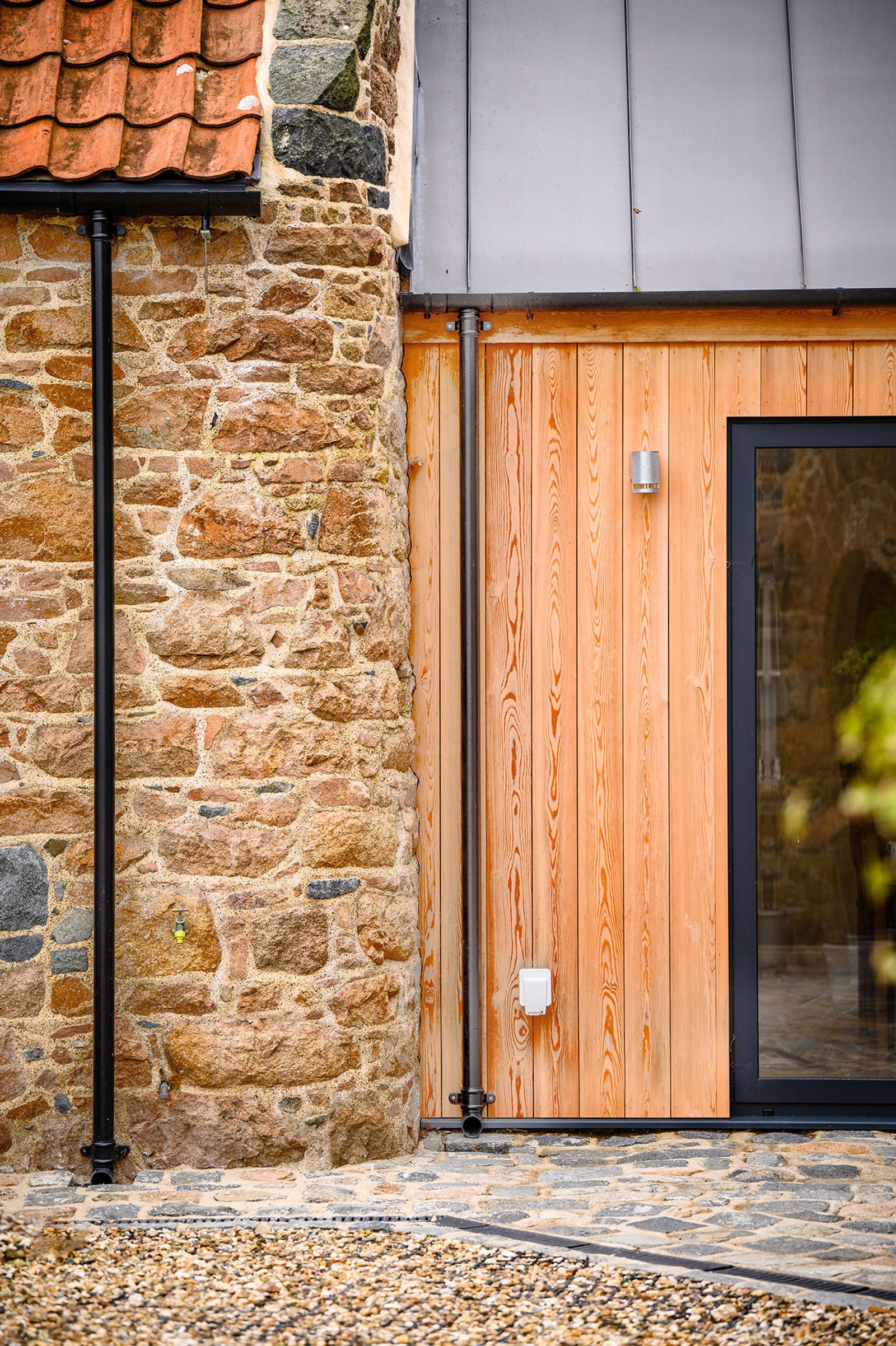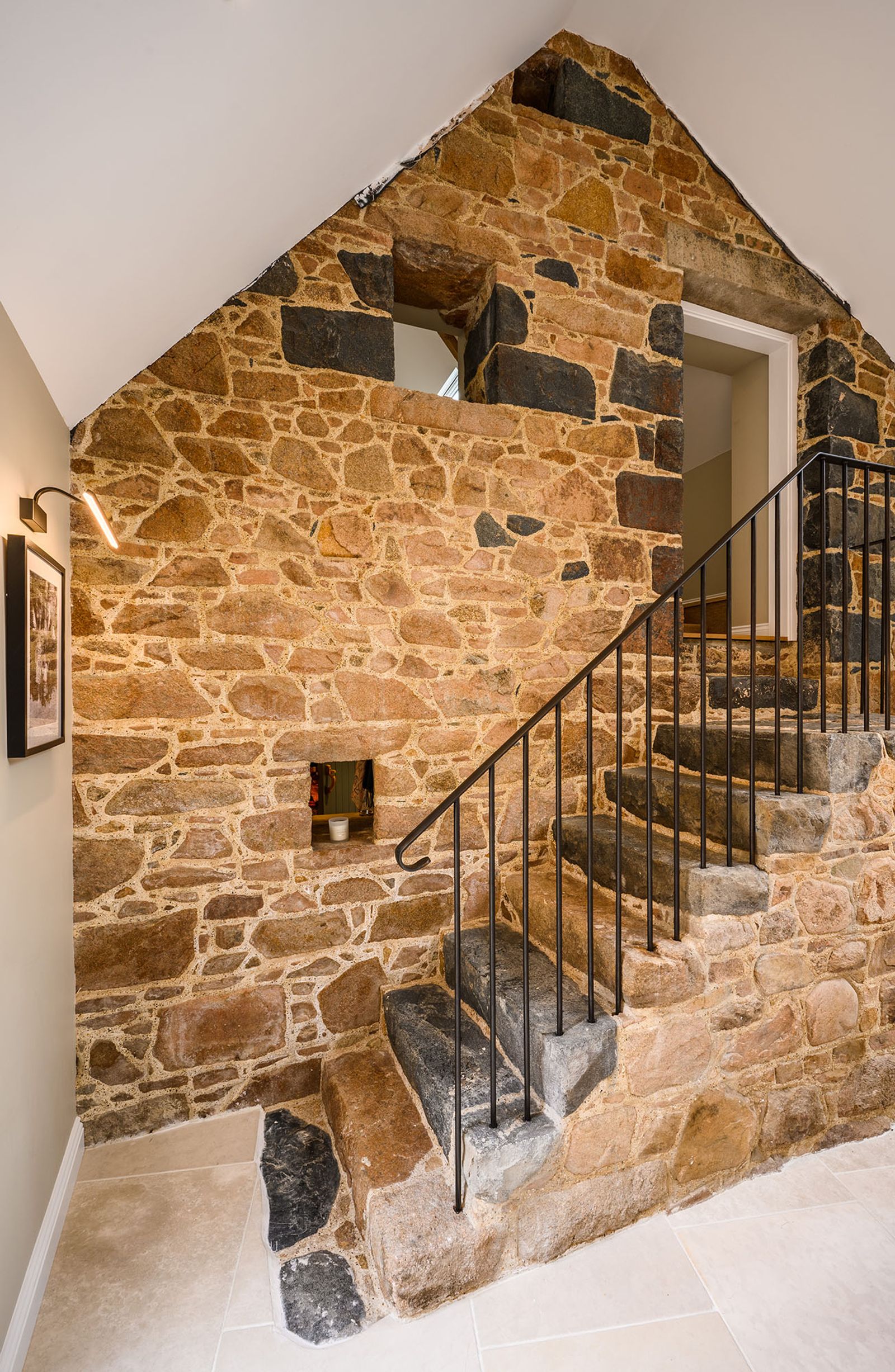 The north gable of the detached barn, built in striking pink granite, held some of the site’s most distinctive features: a flight of external steps and a series of small window openings. Rather than obscure them, the new link was designed to frame and celebrate these elements, making them central to the character of the finished building.