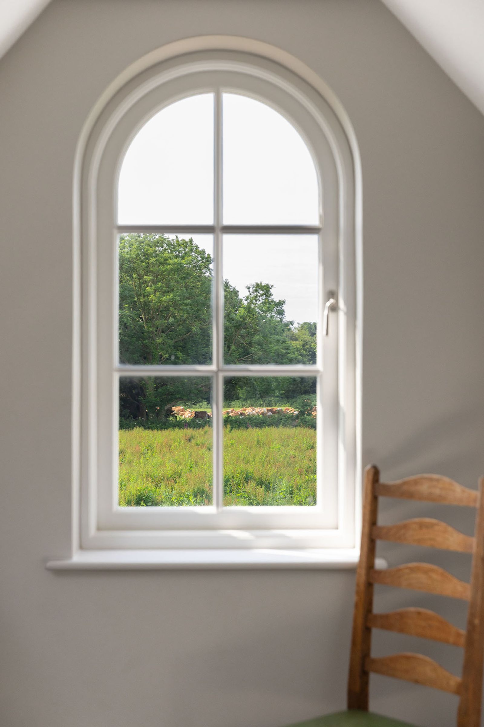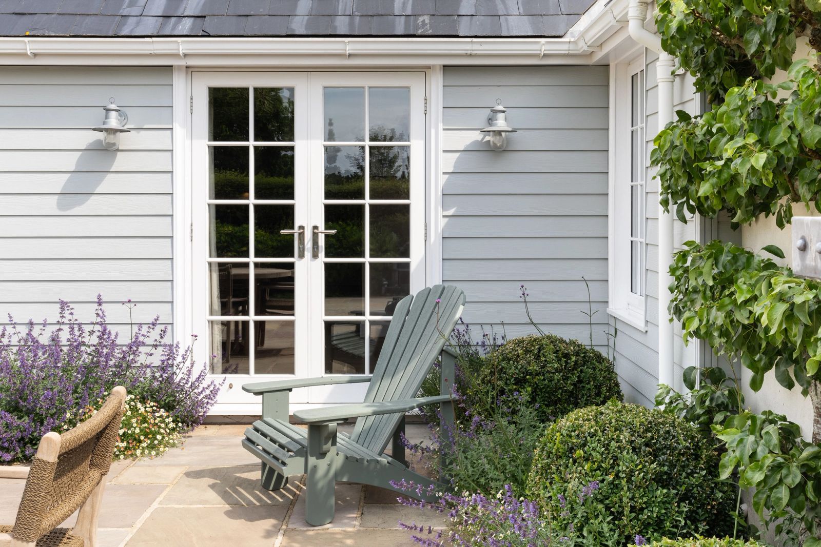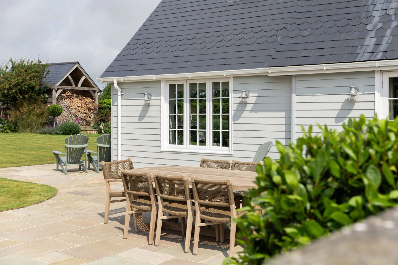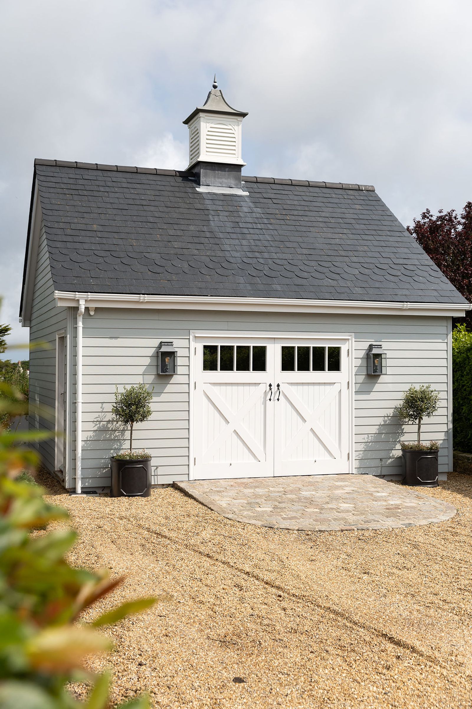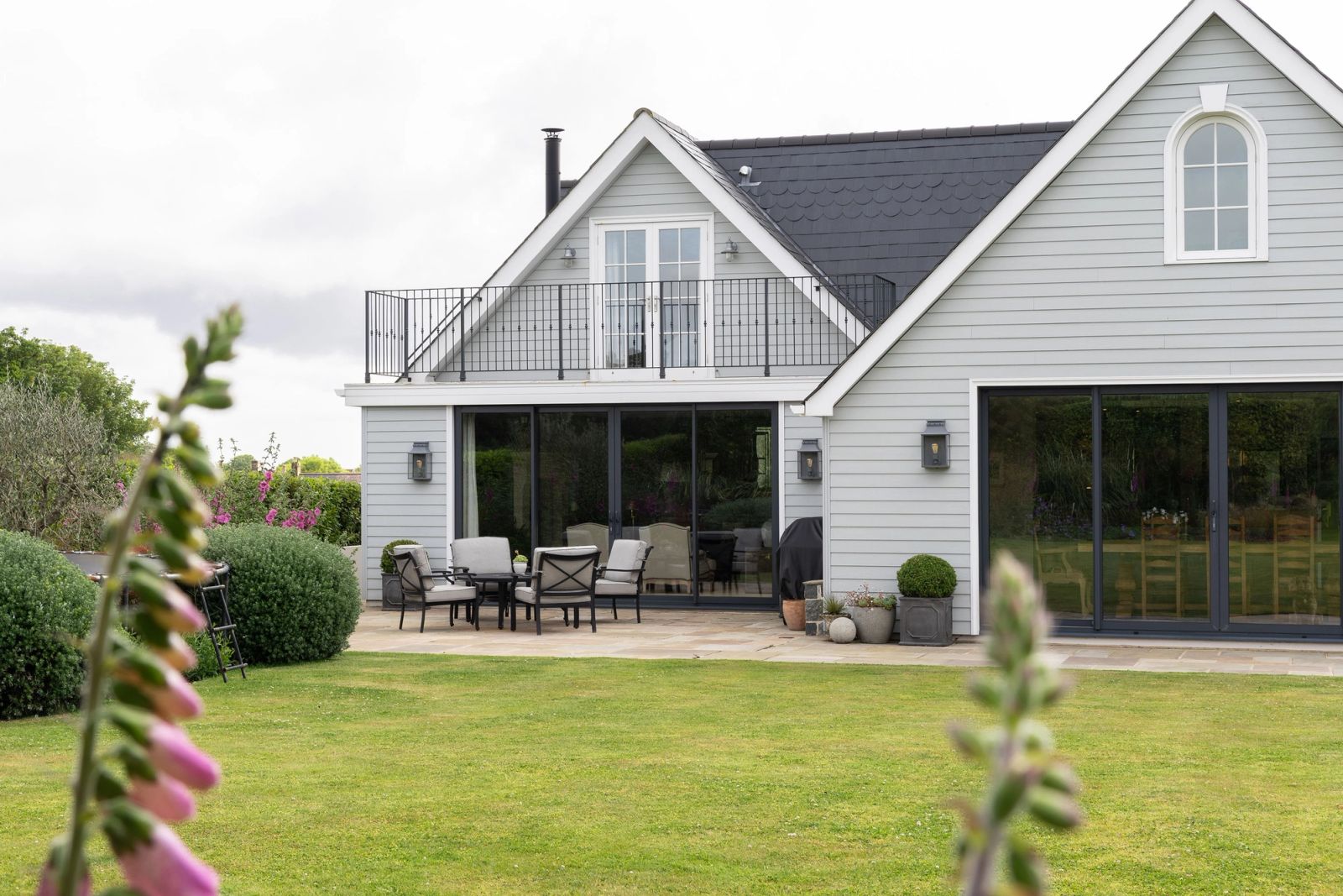 A substantial two-storey extension was added to the garden elevation, creating a generous open-plan living space, while three large bedrooms with en-suites were introduced on the first floor. An adjoining garage, complete with a cupola, complements the main house.