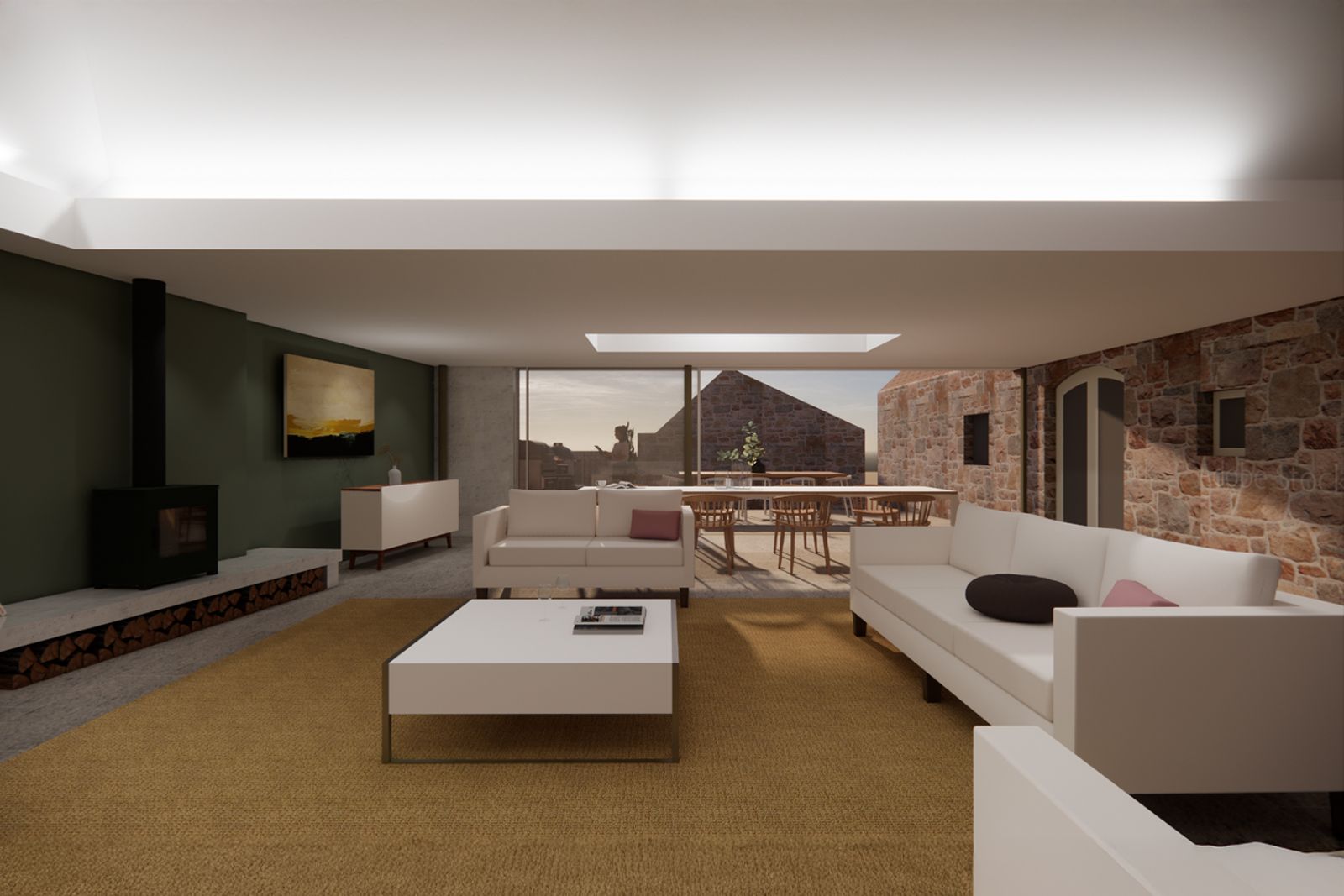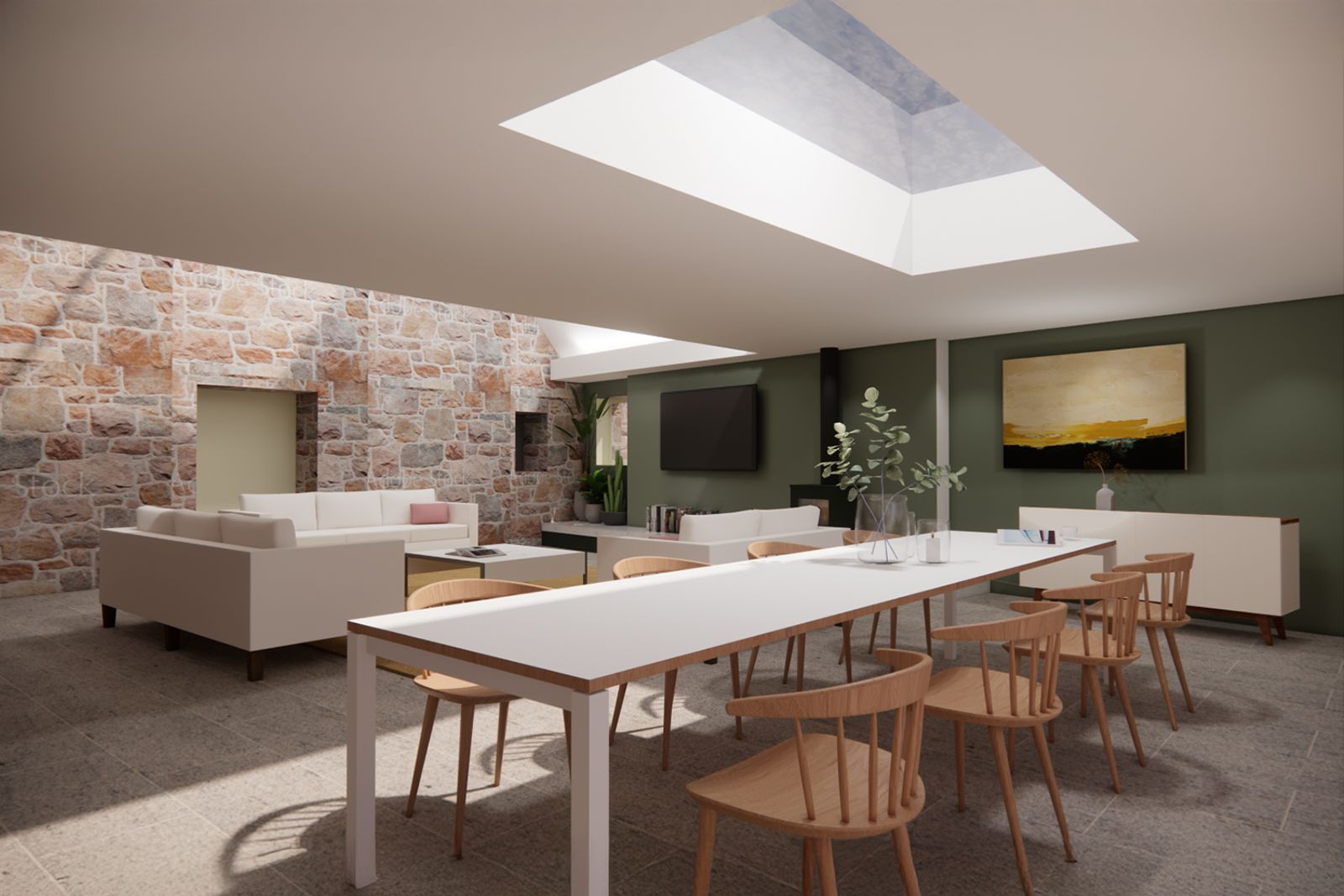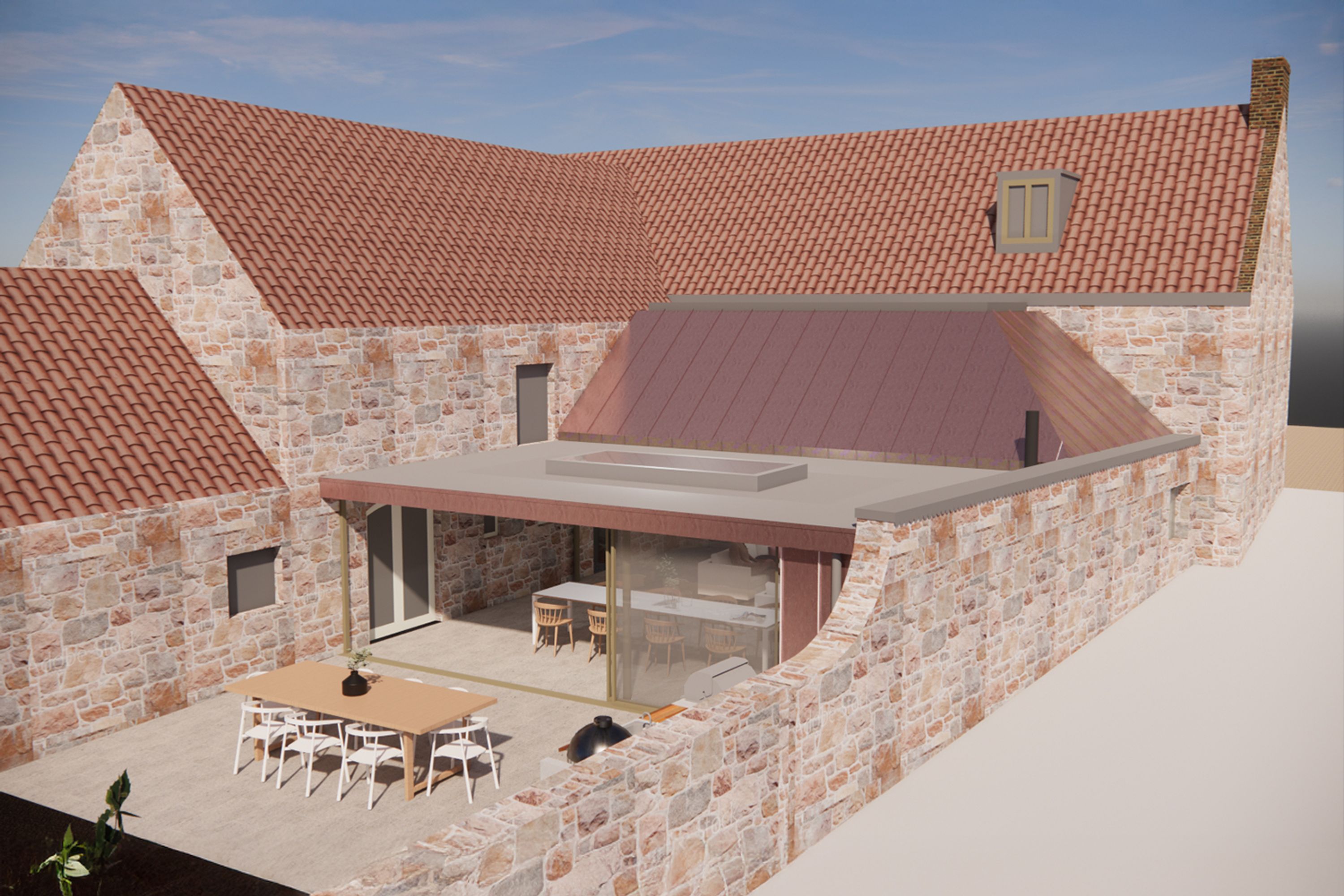 The extended family home sits comfortably within its quiet lane, with a standing-seam zinc roof in a red oxide finish that complements the original granite walls.