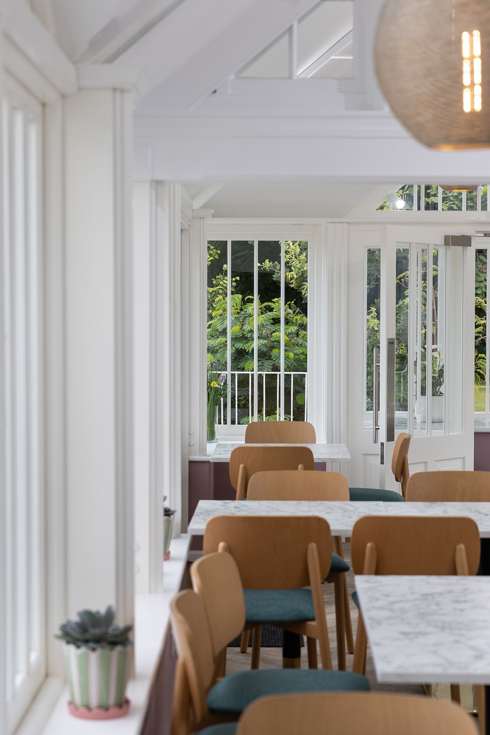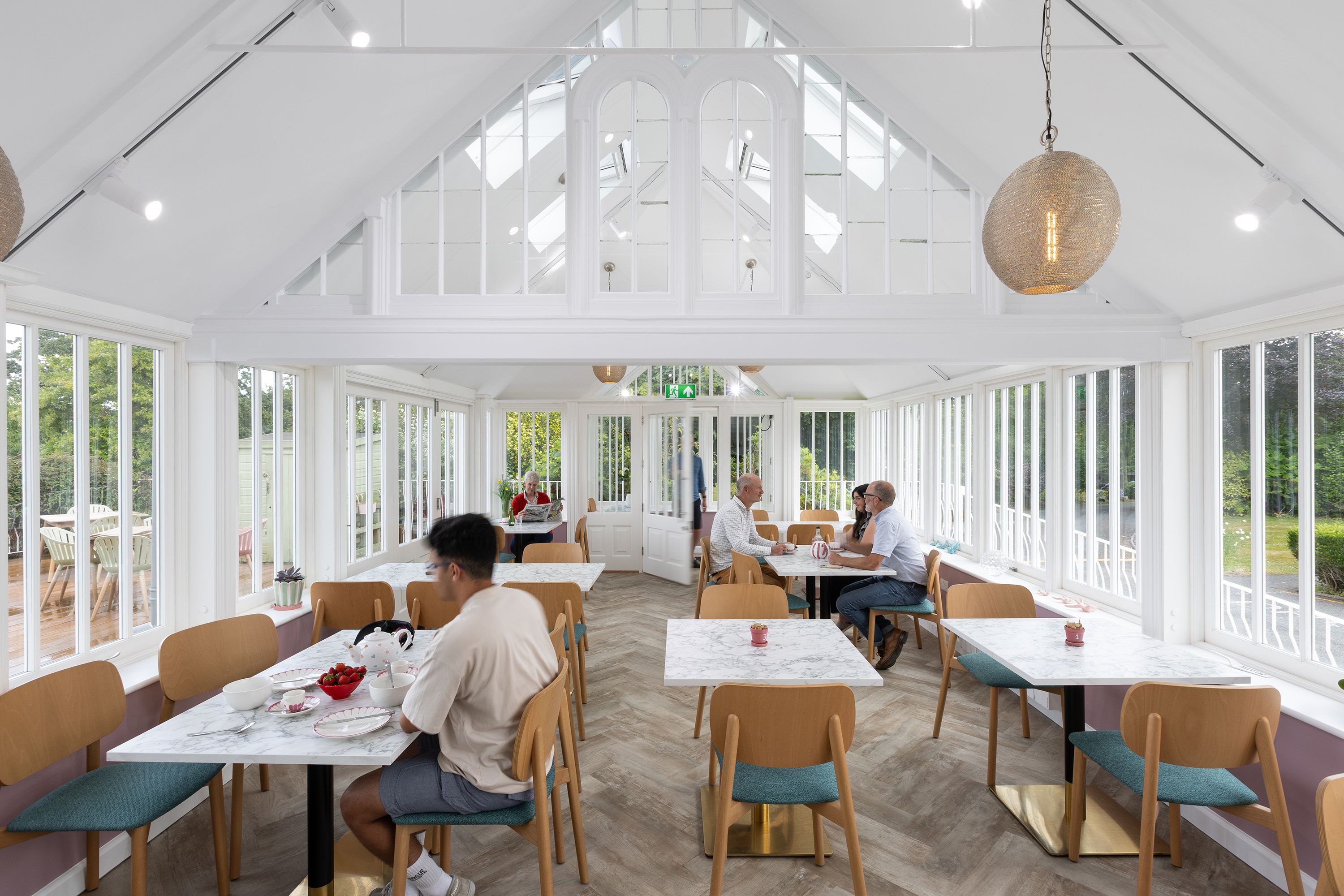 The coffee shop at Les Cotils is a contemporary extension to the historic glasshouse originally attached to the main house. Over time, alterations and repairs, including polycarbonate roof sheeting, had compromised both the timber structure and the building’s ability to regulate temperature, causing overheating in summer and excessive cooling in winter.