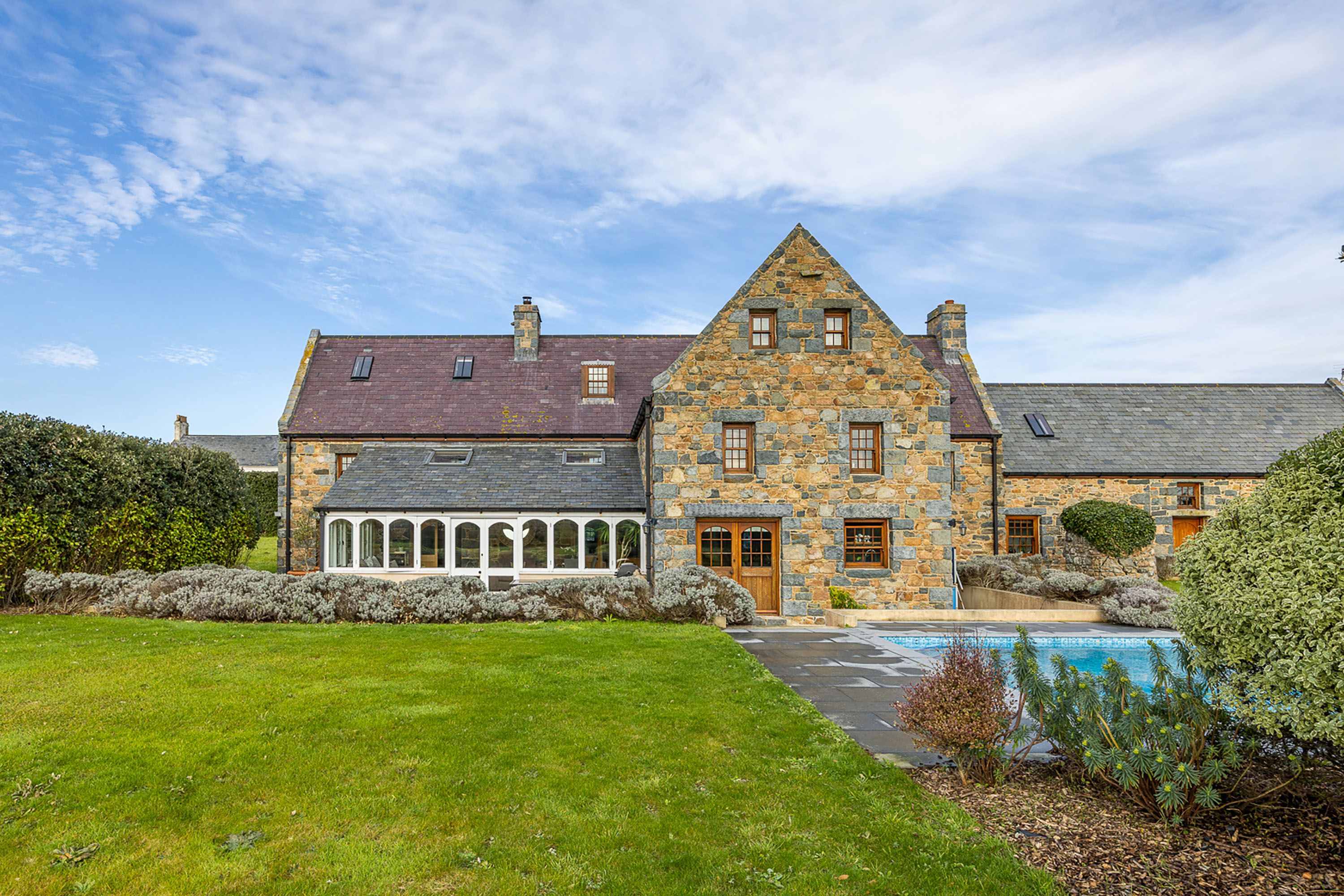 To the rear, a swimming pool and sun terrace extend directly from the living spaces, framed by a fully landscaped garden. A covered parking area, built using traditional construction methods, links the main house with the cottage, providing both practical connectivity and a sense of architectural continuity.