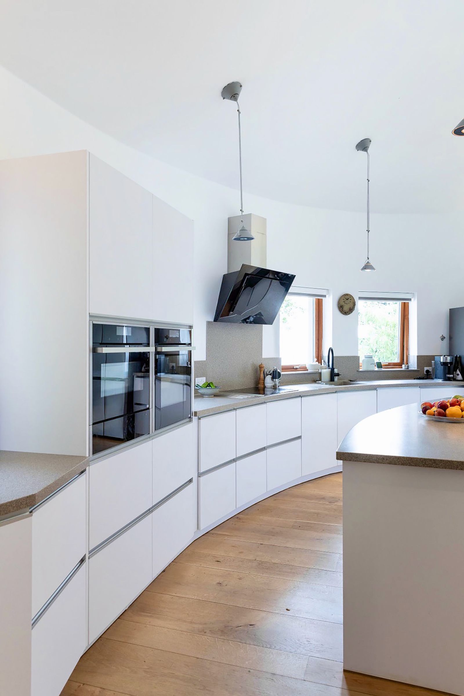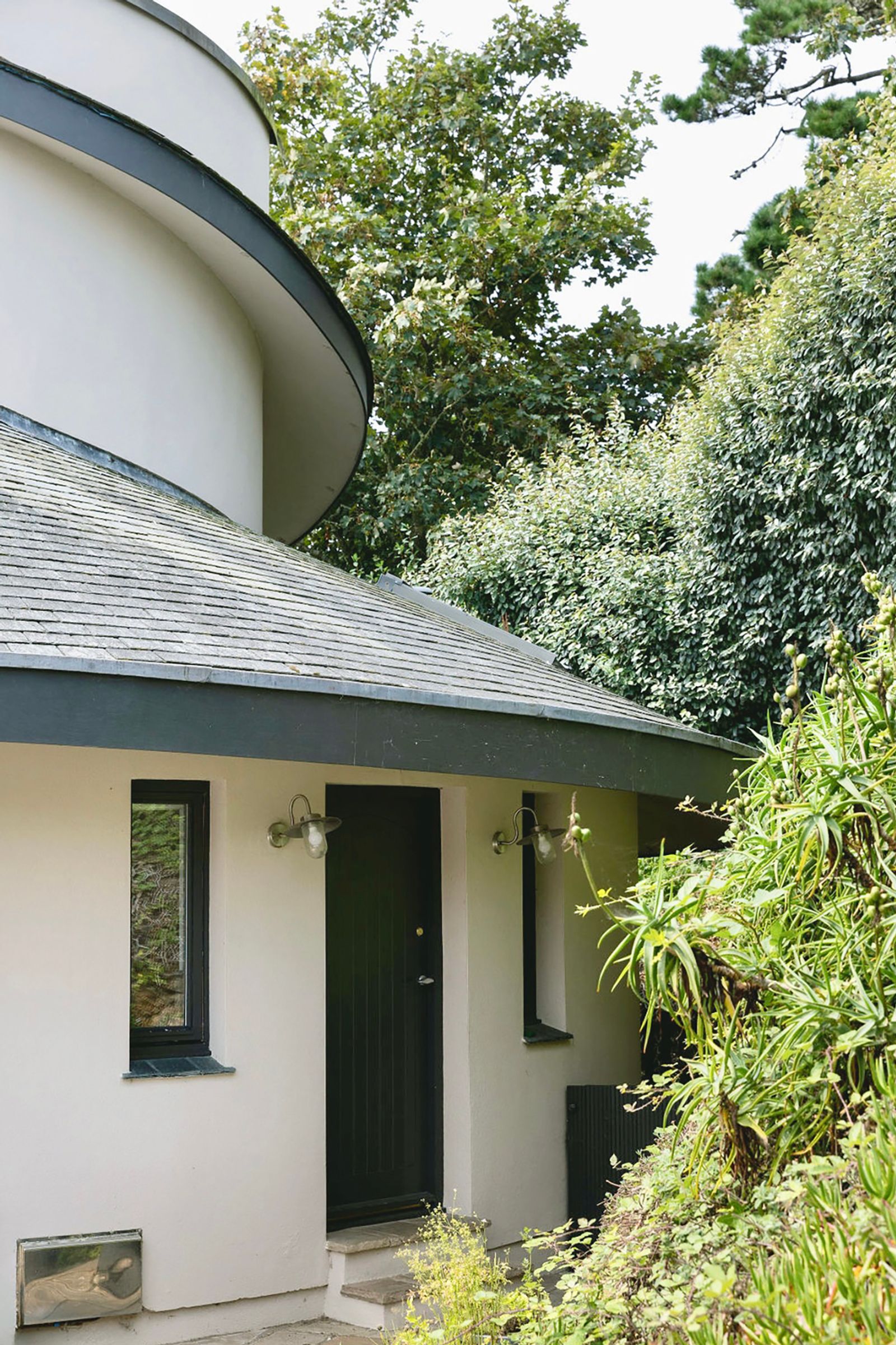 L’Escargot is a striking, spiral-shaped house set at the head of a wooded valley, offering dramatic views of the cliffs and sea. Its flowing form, curved lime-rendered walls, and sweeping slate roof combine inventive design with careful craftsmanship, creating a modern home that sits harmoniously within its natural surroundings.