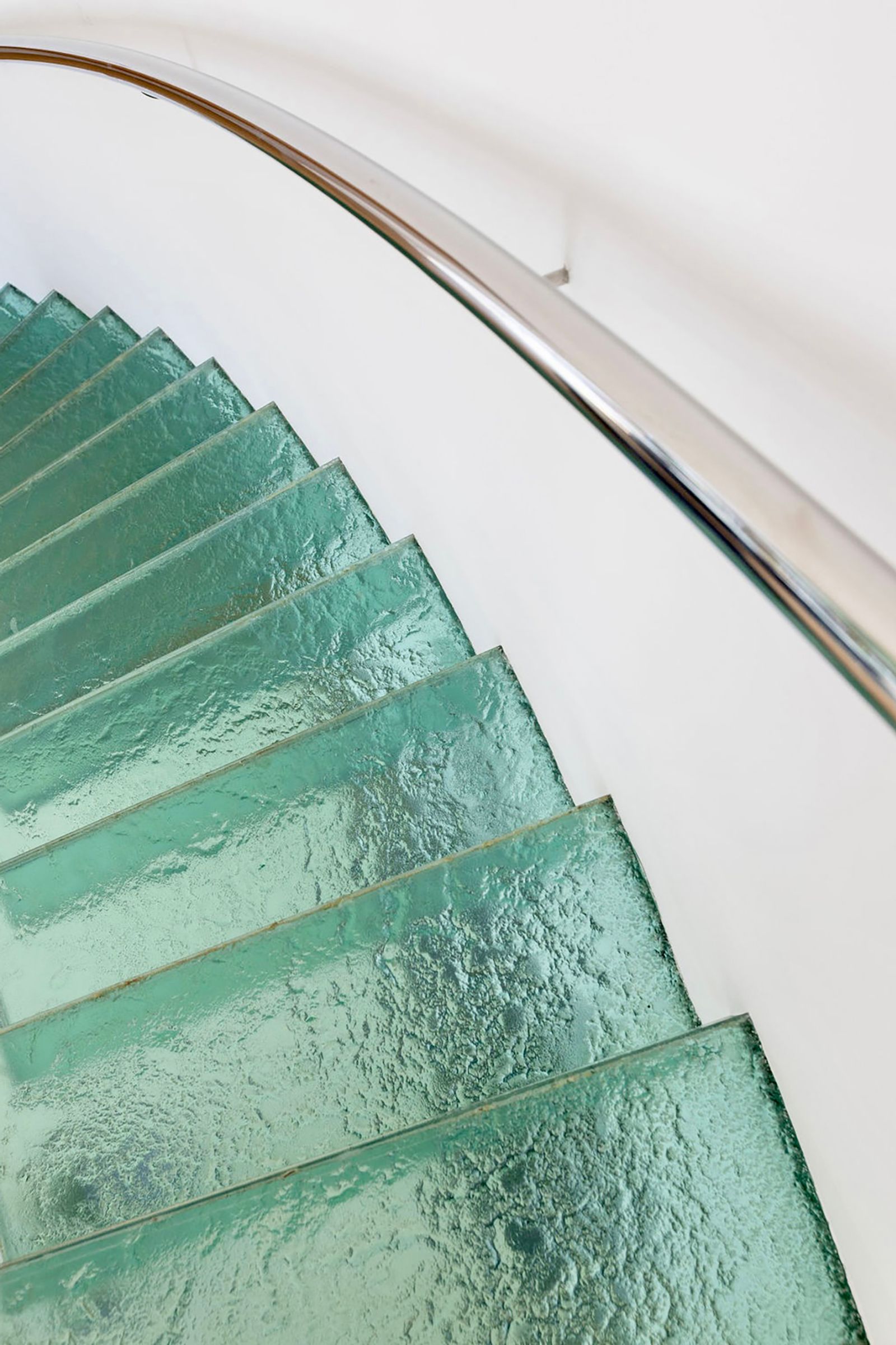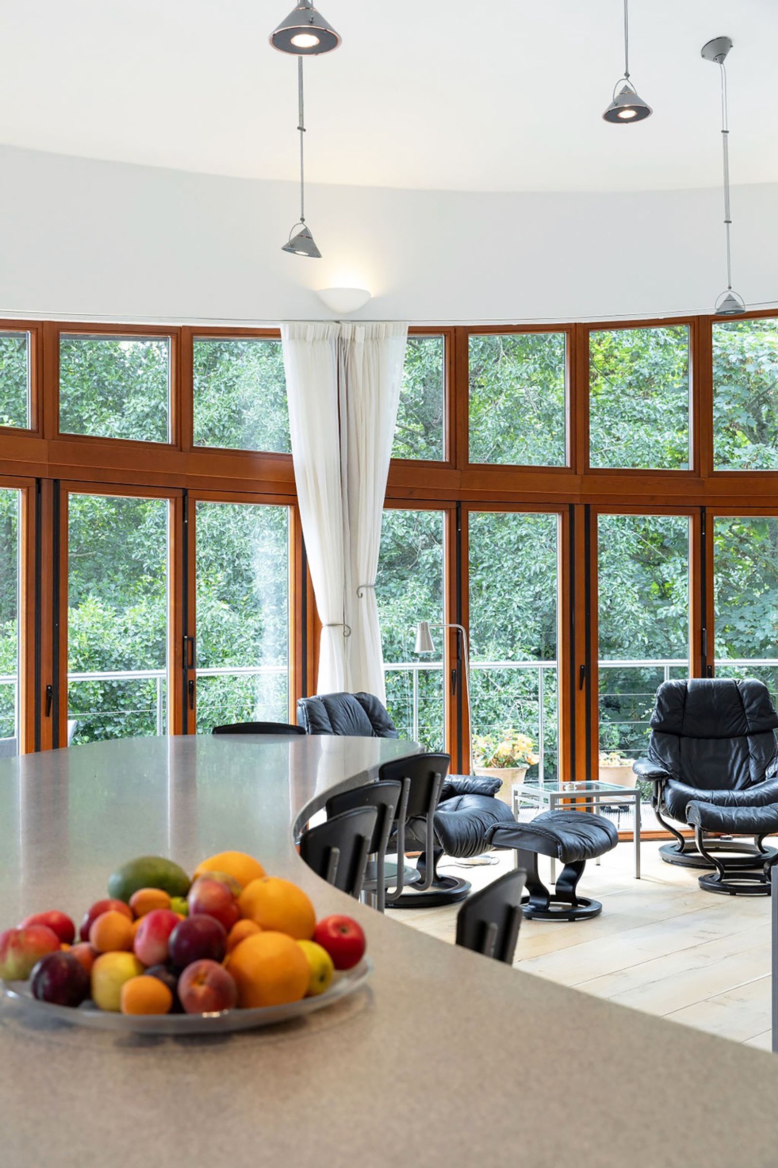 A curved floating staircase with cantilevered glass treads leads to a high-level study platform overlooking the main room. The aesthetic is modern, minimalist and meticulously detailed, yet the building sits naturally within its wooded setting.
