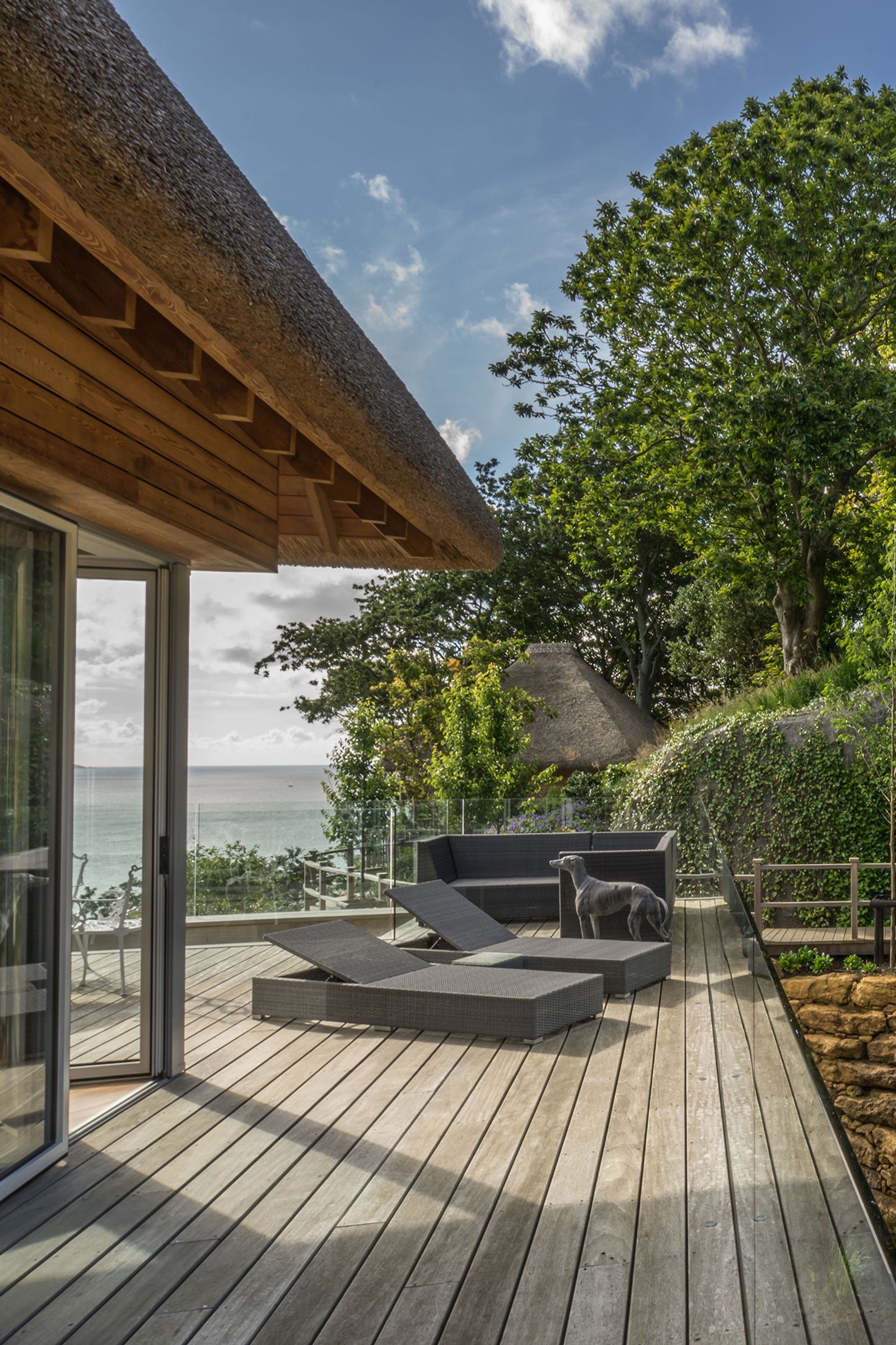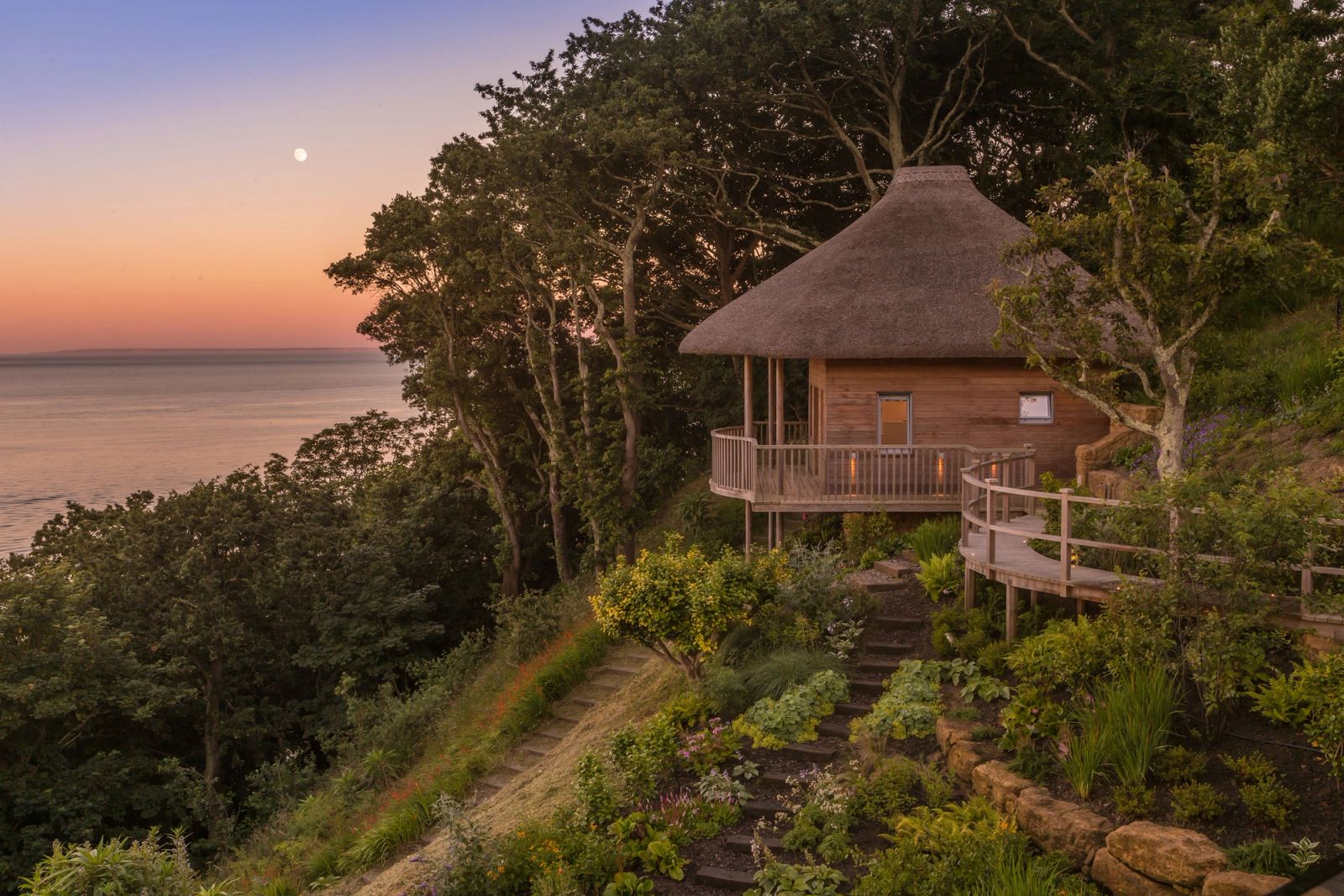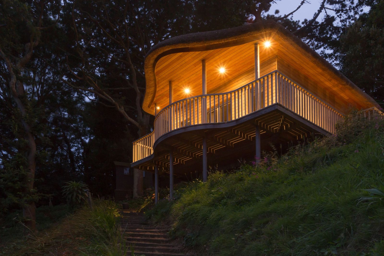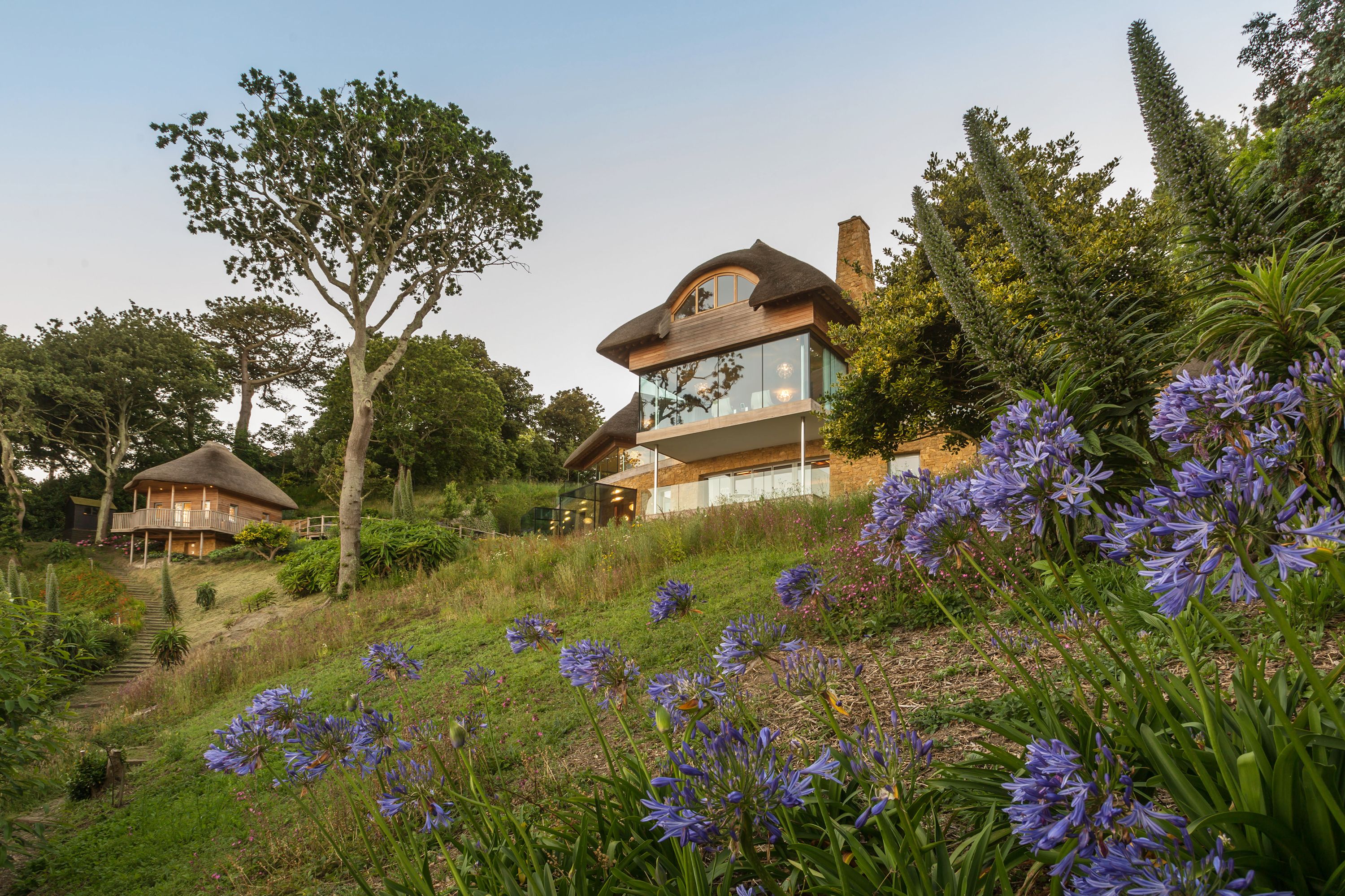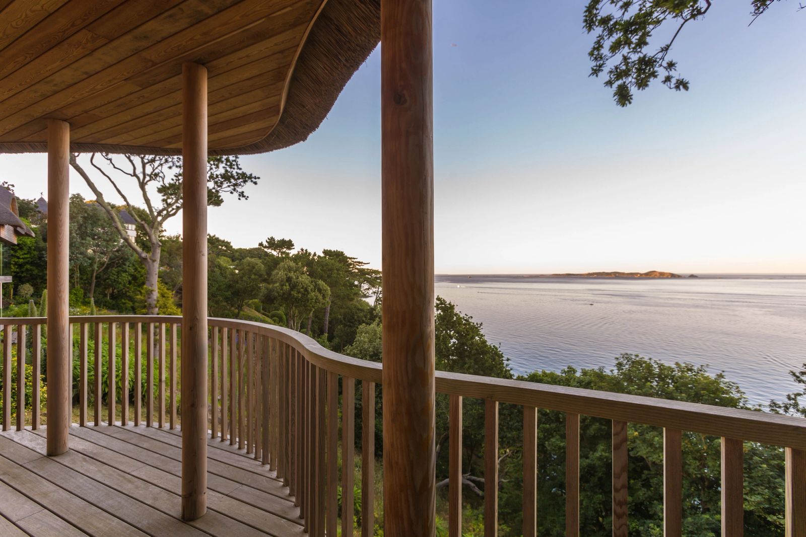 Maison de la Falaise is a bespoke private dwelling carved into a hollow in the cliff face, integrating water, natural stone, timber, and thatch. From the entrance, it appears as a modest thatched cottage, yet the curved plan and flowing volumes reveal dramatic views and changing perspectives throughout the living spaces.