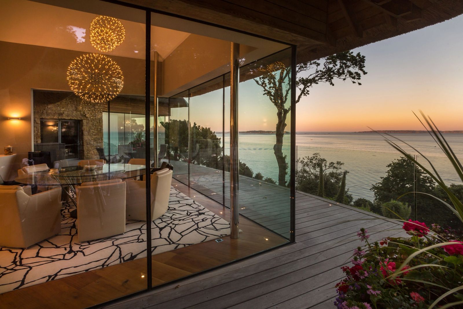 Boardwalks and bridges link terraces to a meadow planted with wildflowers, shrubs, and trees, framing views to Herm and Sark.