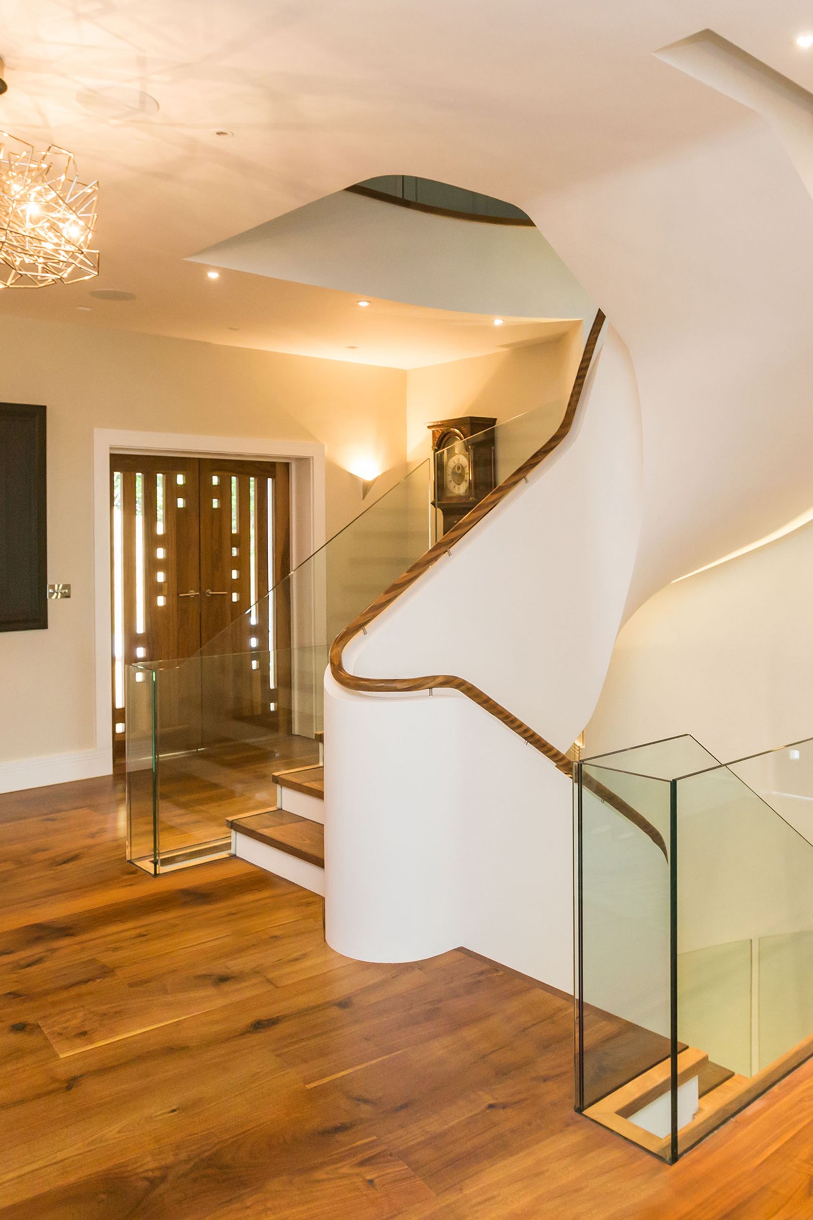 Internally, a three-storey ribbon staircase of slender cantilevered concrete treads and deeply recessed glass balustrades connects the levels. Fireplaces in white and polished blue Lias add subtle texture and detail.