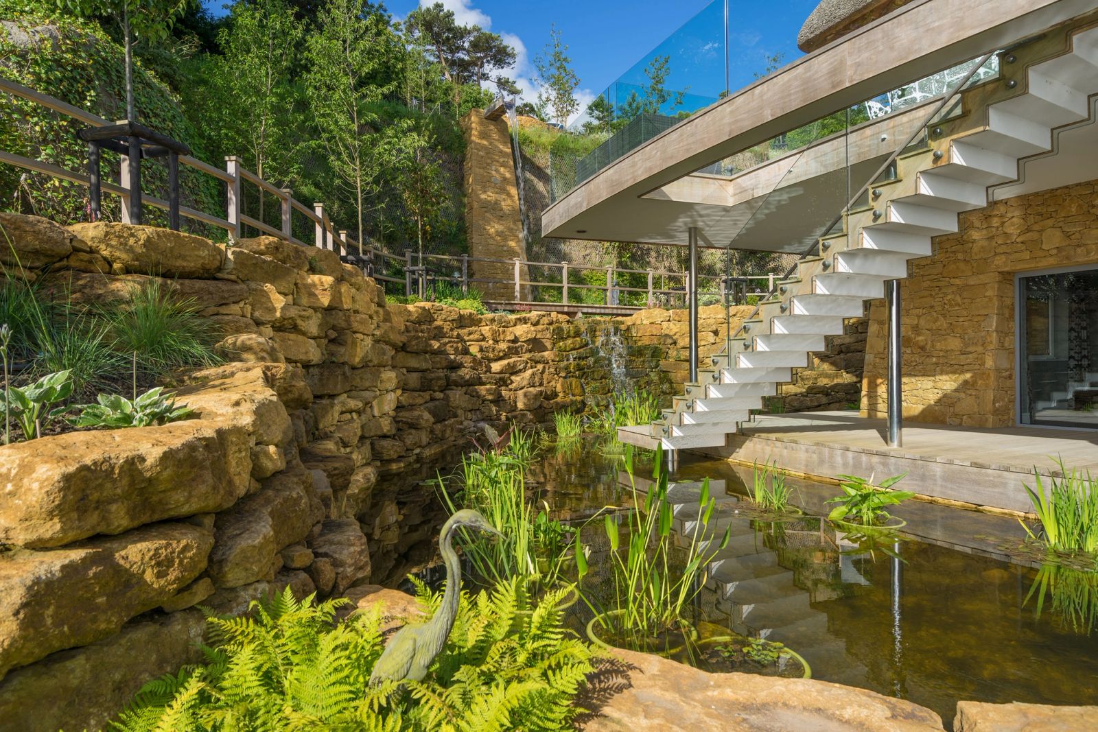 The landscape, designed with Stephen Welch, unifies house and garden through matched materials, seamless level changes, and extensive glazing. A walkway follows the cliff contours with the sound of a waterfall, while a tranquil pool forms the lower terrace.