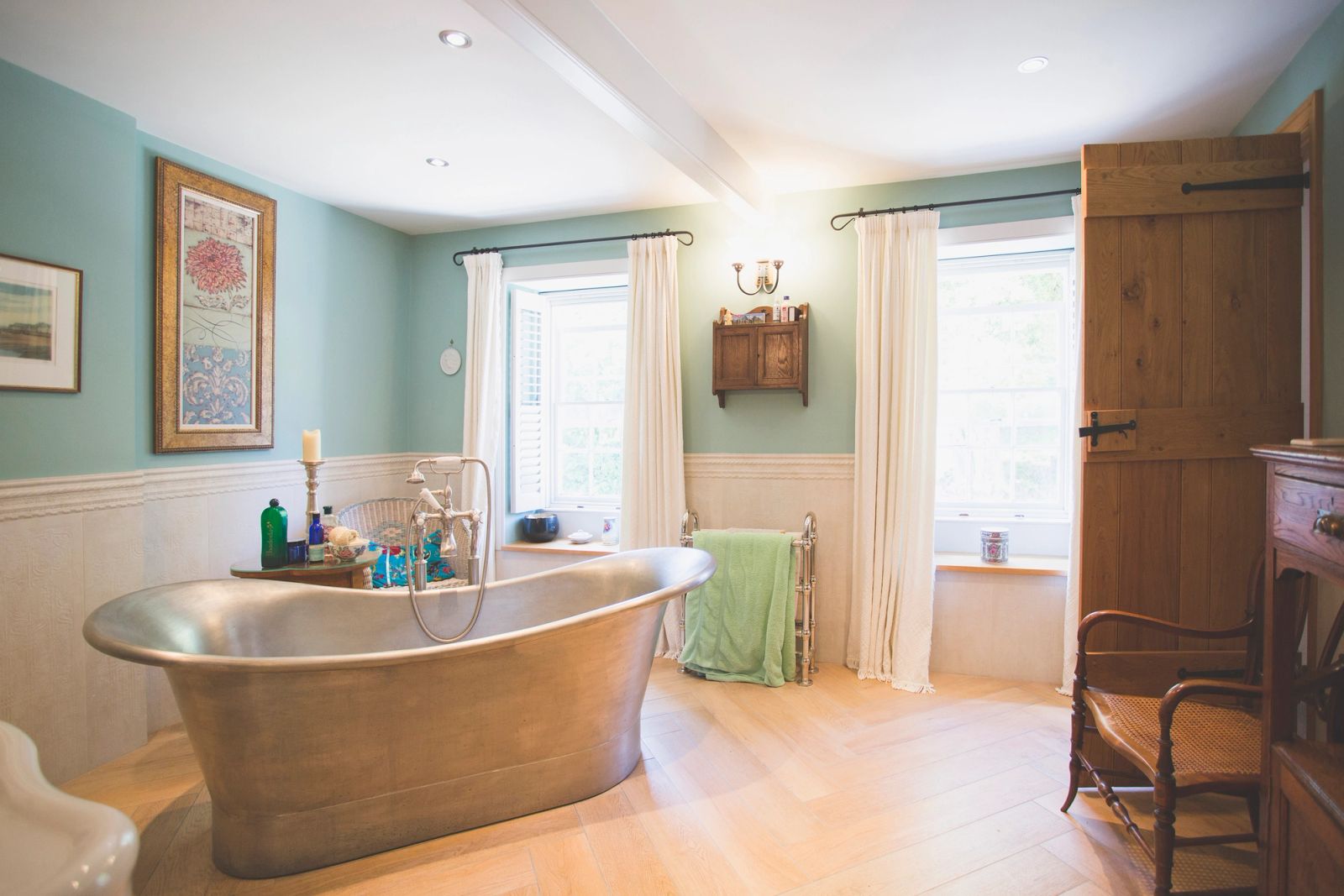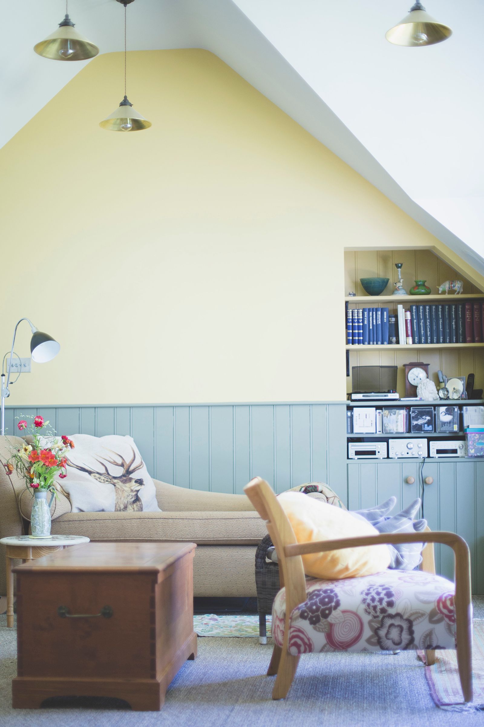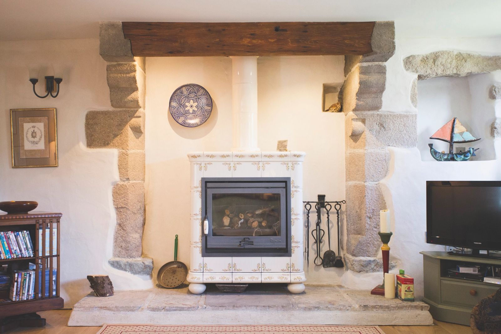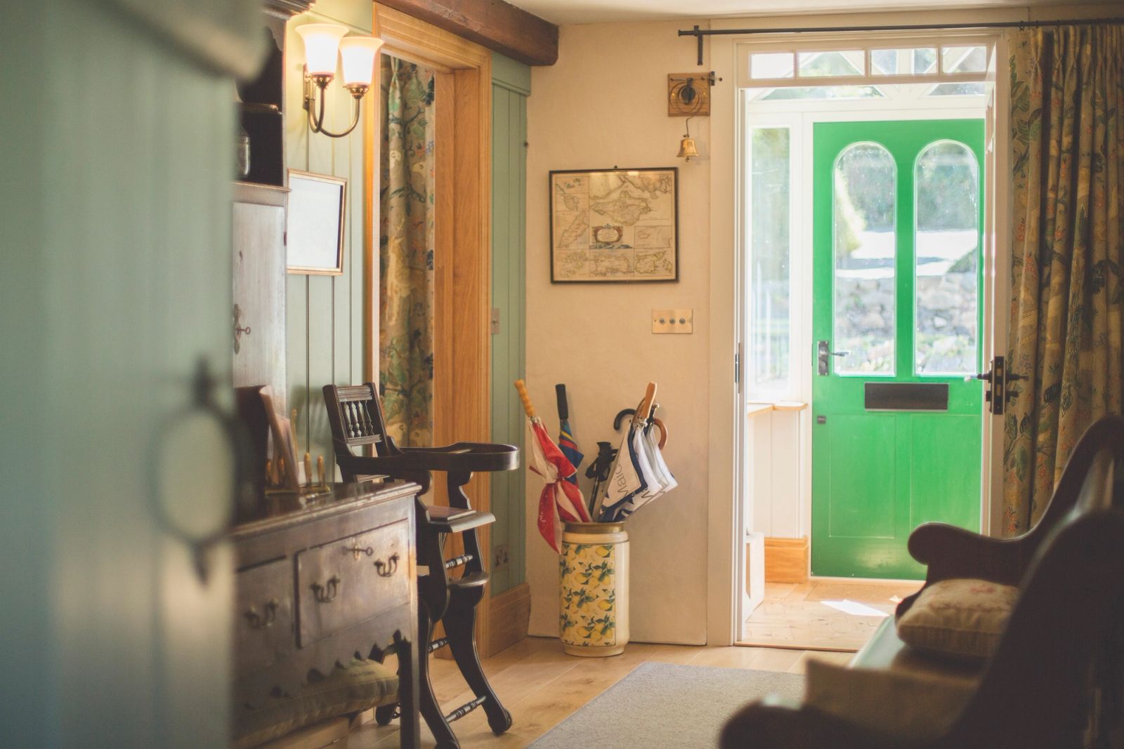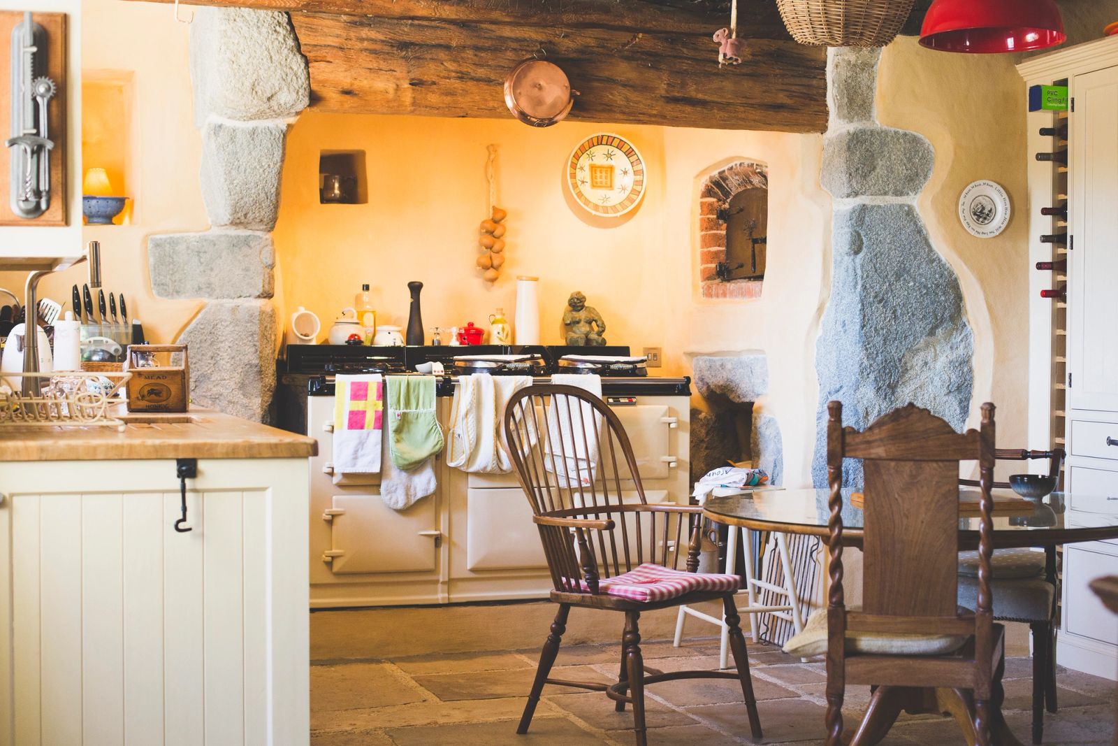Inside, natural light is maximised and a playful yet restrained colour scheme complements the exposed granitework. Vertical tongue-and-groove boarding, lime plaster, flagstones, and structural timber rafters combine to create a warm, practical, and attractive interior that balances character with everyday living.