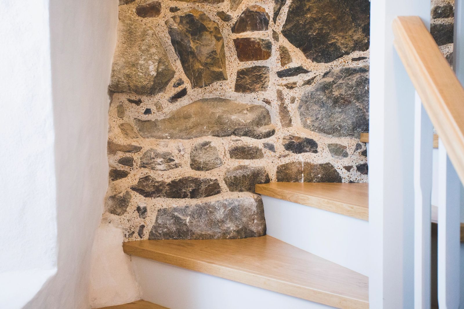 The works included reconstructing the previously-demolished rear tourelle, reforming original window openings, and adding two internal staircases. The granite exterior was carefully lime-pointed, and a small rear extension was added.