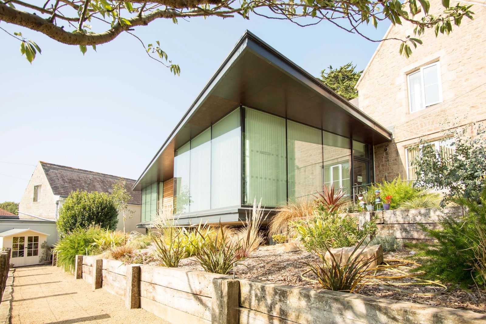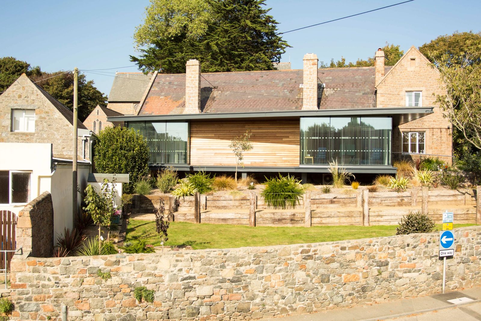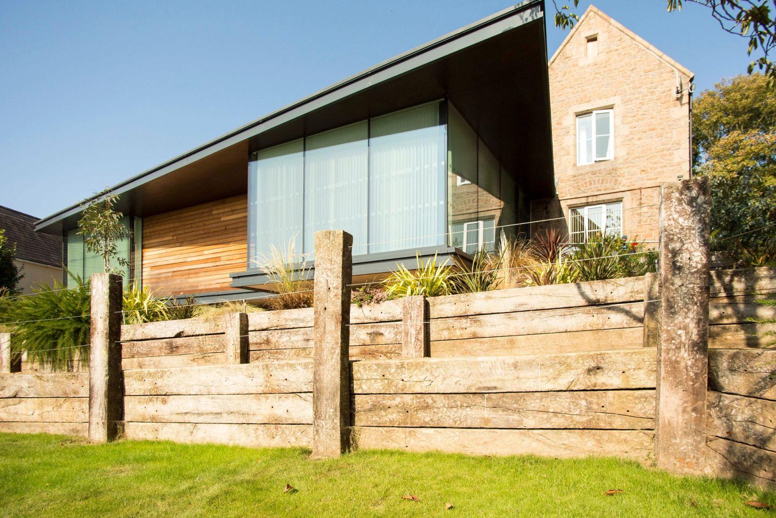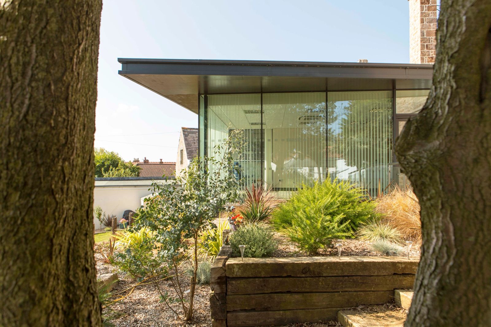 Soft landscaping integrates the building into its sloping site, with a timber-sleeper path and carefully selected shrubs and trees enhancing the setting.