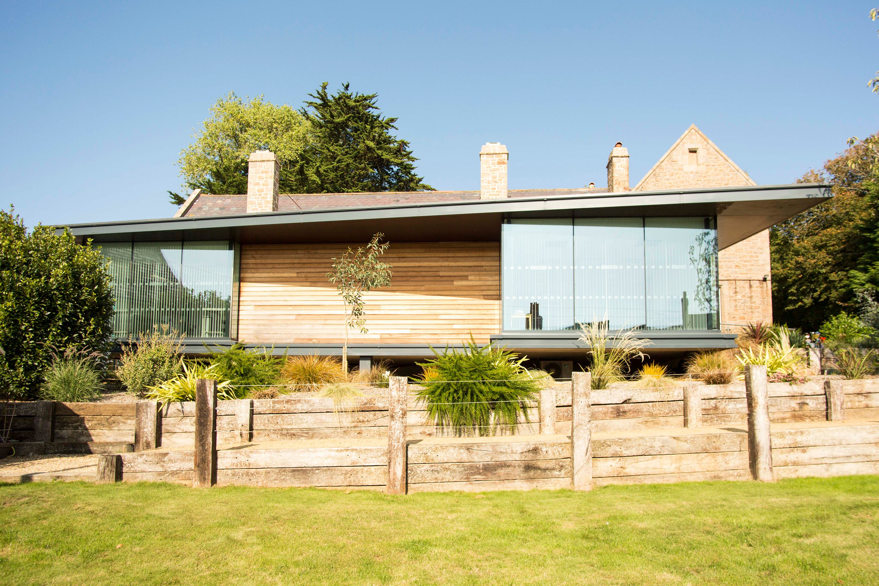 Positioned to the rear of the original granite hall, the new structure is discreet from the entrance but appears to float above a landscaped garden when viewed from the road below. Frameless floor-to-ceiling glazing and horizontal timber boarding provide a striking counterpoint to the pink granite, while emphasising the strong horizontality of the design. A slender asymmetrical flat roof and minimal steel platform define the roof and floor slabs as thin grey bands.