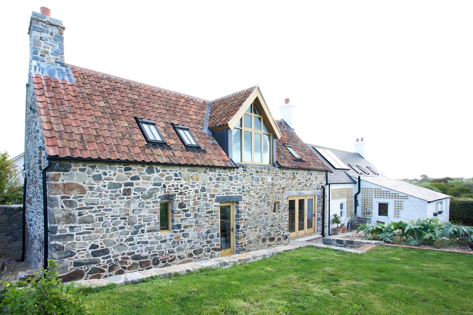 The road-facing elevation was reinstated in traditional form, with original openings reopened and a new clay pantile roof. In contrast, the garden elevation adopted a more contemporary approach, maximising light, views and the south-west orientation. Internally, historic features were retained and the fireplace reconstructed.
