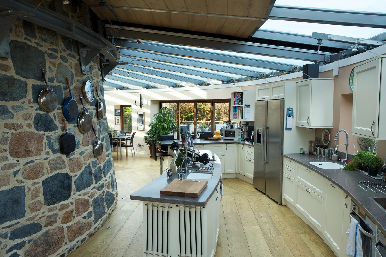 The brief was twofold: to extend the showroom in a contemporary form, and to create additional accommodation on the floor immediately above. At the time, the first floor was encircled by the roofless remains of a granite perimeter wall — a fragment of the mill’s original structure.
